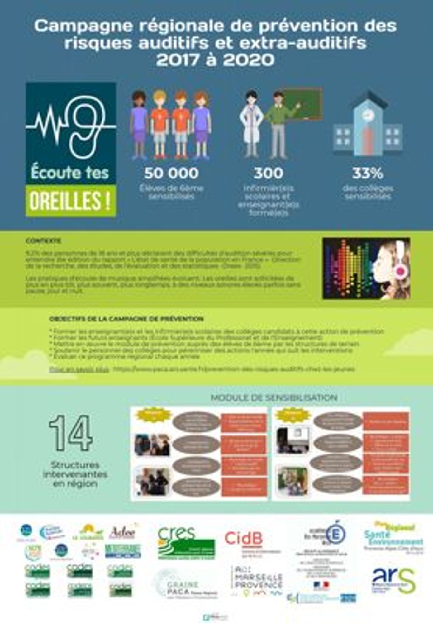 - Mettre en œuvre le module d’éducation à la santé environnementale « Ecoute tes oreilles » auprès de groupes de préadolescents du département des Alpes Maritimes dans des collèges volontaires (CODES, structures EEDD)