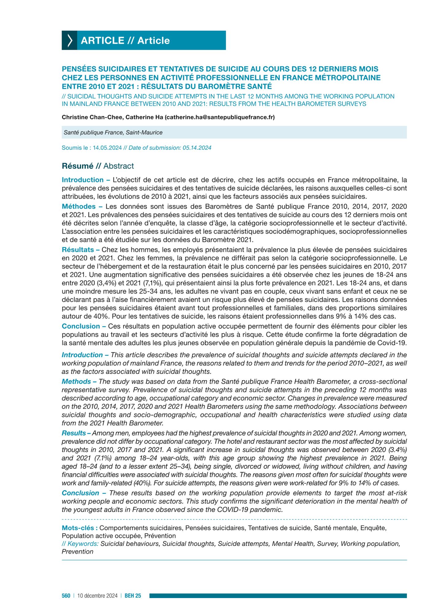- Méthodes – Les données sont issues des Baromètres de Santé publique France 2010, 2014, 2017, 2020 et 2021. Les prévalences des pensées suicidaires et des tentatives de suicide au cours des 12 derniers mois ont été décrites selon l'année d'enquête, la classe d'âge, la catégorie socioprofessionnelle et le secteur d'activité. L'association entre les pensées suicidaires et les caractéristiques sociodémographiques, socioprofessionnelles et de santé a été étudiée sur les données du Baromètre 2021.