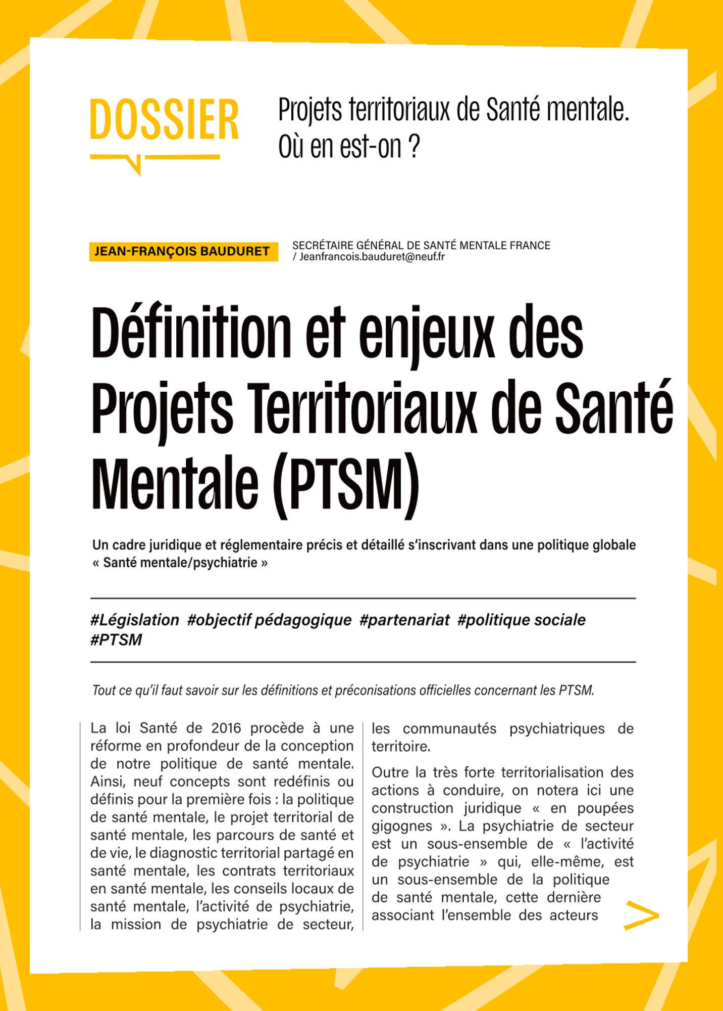 À la suite de la loi de modernisation de notre système de santé de 2016 et du décret de 2017, les PTSM s’imposent comme un outil central de la politique de santé mentale. En renforçant les actions, de terrain, en dépassant une approche strictement sanitaire et en favorisant la coordination entre acteurs du sanitaire, social et médico-social. Cette approche permet une réelle amélioration des parcours de santé et de vie, sans rupture pour les personnes concernées.