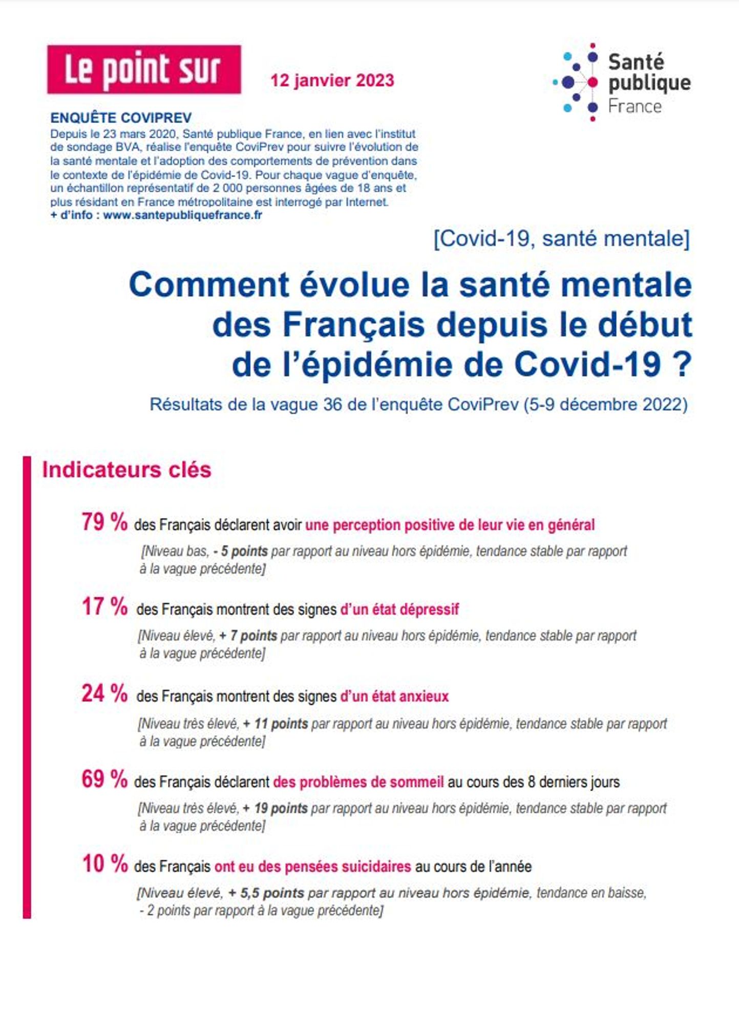 - 0 % des Français montrent des signes d'un état dépressif. Niveau élevé, + 7 points par rapport au niveau hors épidémie, tendance stable par rapport à la vague précédente.