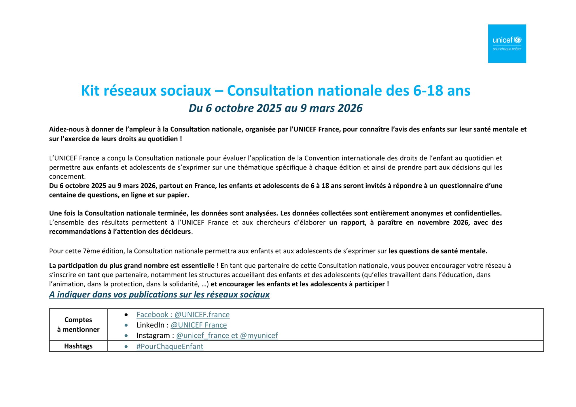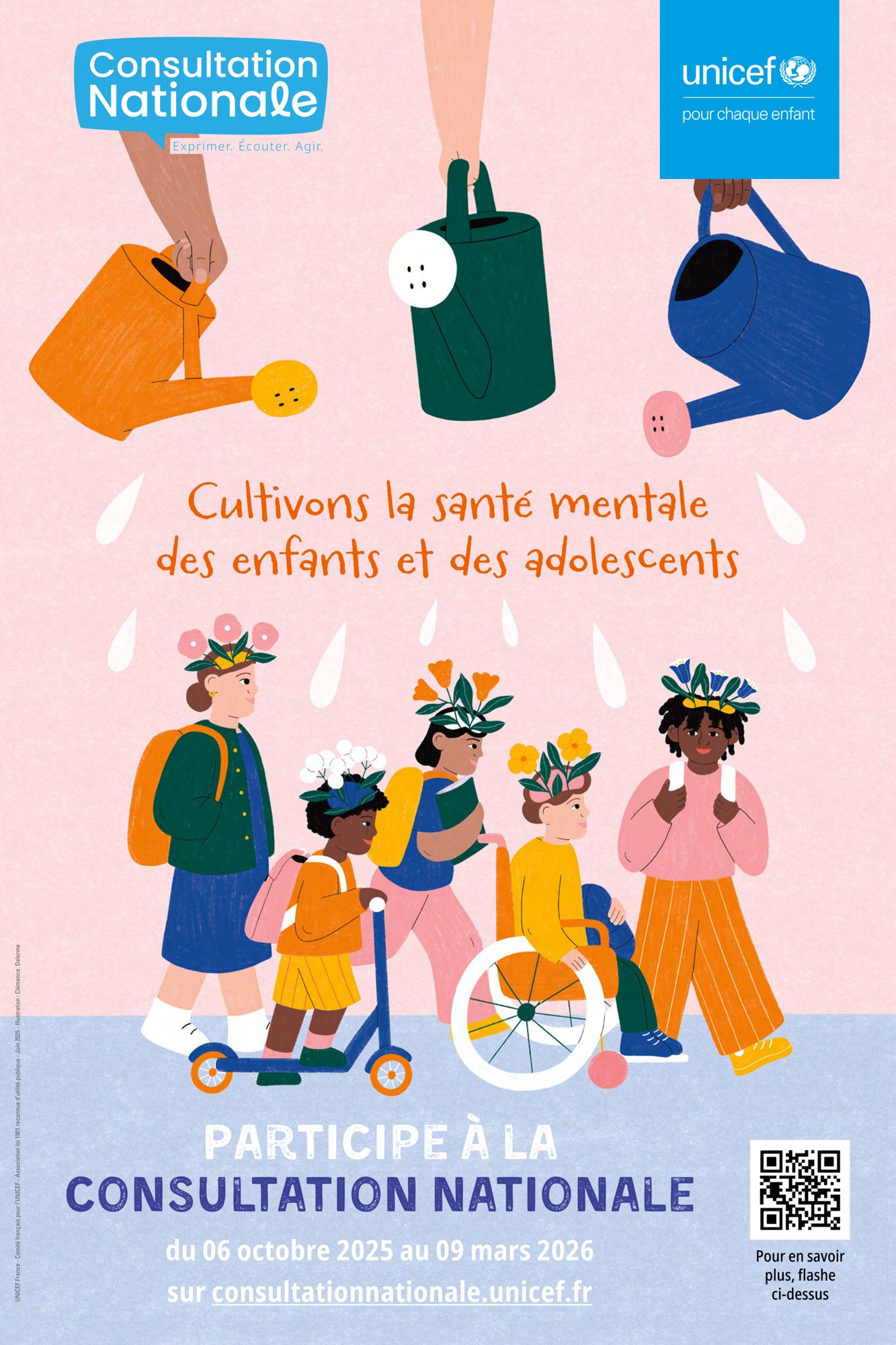 Du 6 octobre 2025 au 9 mars 2026, l’UNICEF France invite chaque enfant et adolescent, âgé de 6 à 18 ans, en hexagone et dans les territoires d’Outre-mer, à s’exprimer sur son quotidien et ses droits et, cette année, plus particulièrement sur le thème de la santé mentale.