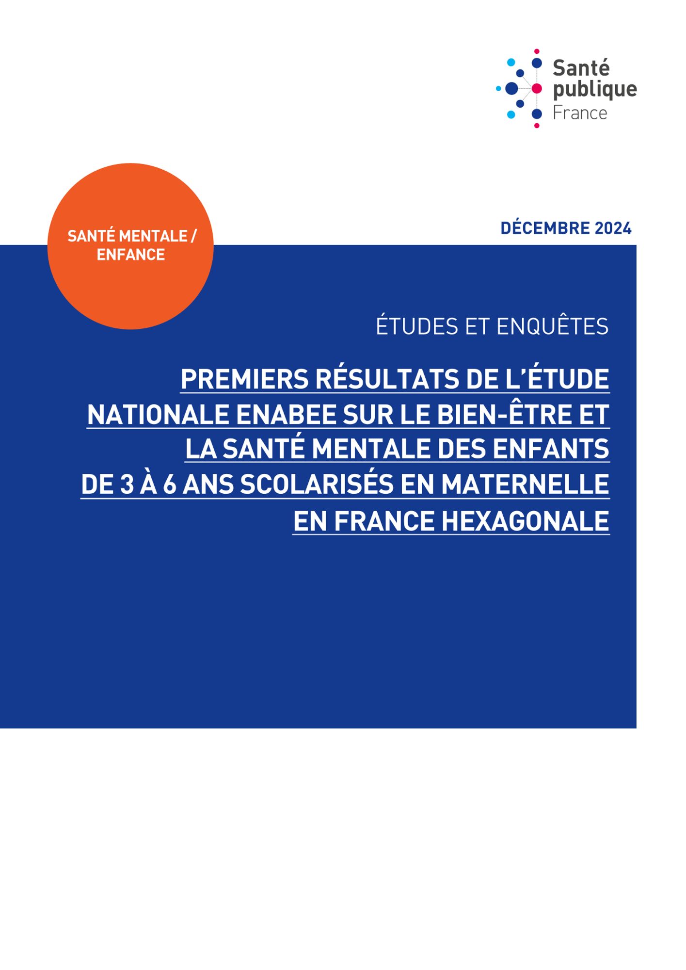 Mise en place en 2022 par Santé publique France, avec l’appui du Ministère de la Santé et de l’Accès aux soins et du Ministère de l’Éducation nationale, l’étude Enabee « Etude nationale sur le bien-être des enfants » vise à approfondir les connaissances sur le bien-être et la santé mentale des enfants âgés de 3 à 11 ans. Elle mesure notamment le niveau de bien-être et la fréquence de certaines difficultés ou troubles probables des enfants scolarisés de la petite section de maternelle (PSM) au cours moyen deuxième année (CM2), en France hexagonale. L’étude Enabee repose sur une évaluation de la santé mentale, par les parents et les enseignants et les enfants eux-mêmes (à partir du Cours préparatoire (CP)). L’étude mesure 3 types de difficultés et troubles probables : émotionnels, oppositionnels ou déficit d’attention avec ou sans hyperactivité (TDAH). Il ne s’agit pas de diagnostics cliniques mais d’une analyse croisée des points de vue déclarés pour chaque enfant, ayant permis d’identifier des symptômes, leur impact sur la vie de l’enfant et, au-delà de certains seuils, des difficultés et troubles probables.