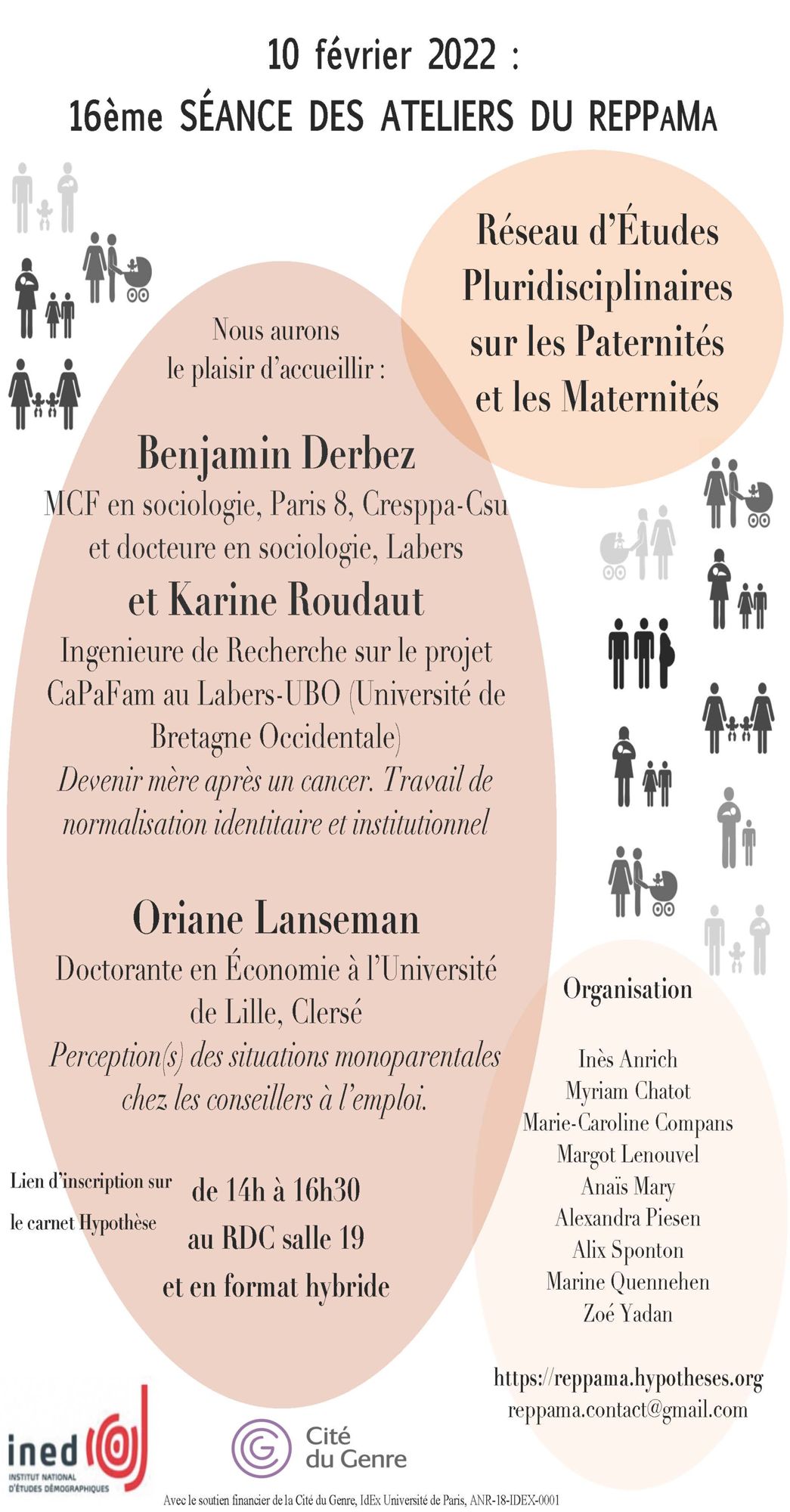 Le Réseau Pluridisciplinaire sur les Paternités et les Maternités (RePPaMa) a le plaisir de vous convier au 16ème atelier du RePPaMa, qui aura lieu à l’INED (Campus Condorcet, Aubervilliers) et en format hybride le jeudi 10 février de 14h à 16h30.