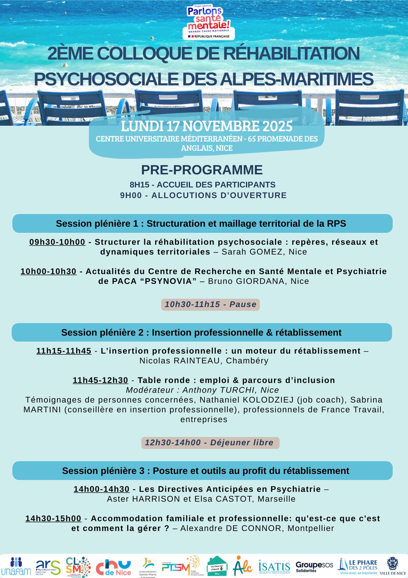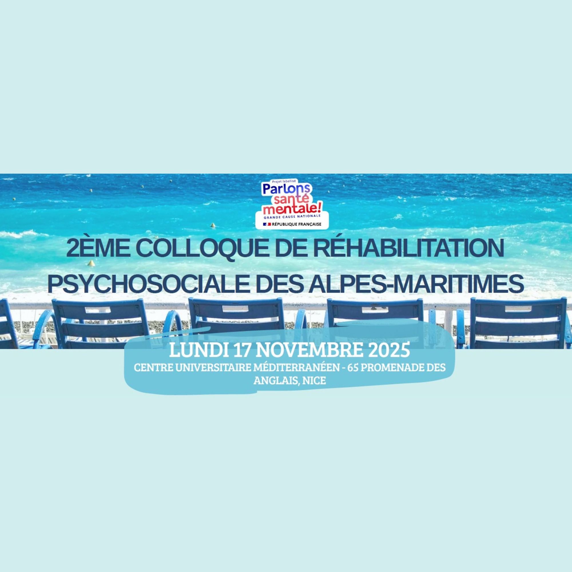 Nous avons le plaisir de vous relayer le pré-programme du 2ᵉ Colloque de Réhabilitation Psychosociale des Alpes-Maritimes, qui se tiendra le lundi 17 novembre 2025 à Nice, au Centre Universitaire Méditerranéen (65 Promenade des Anglais).