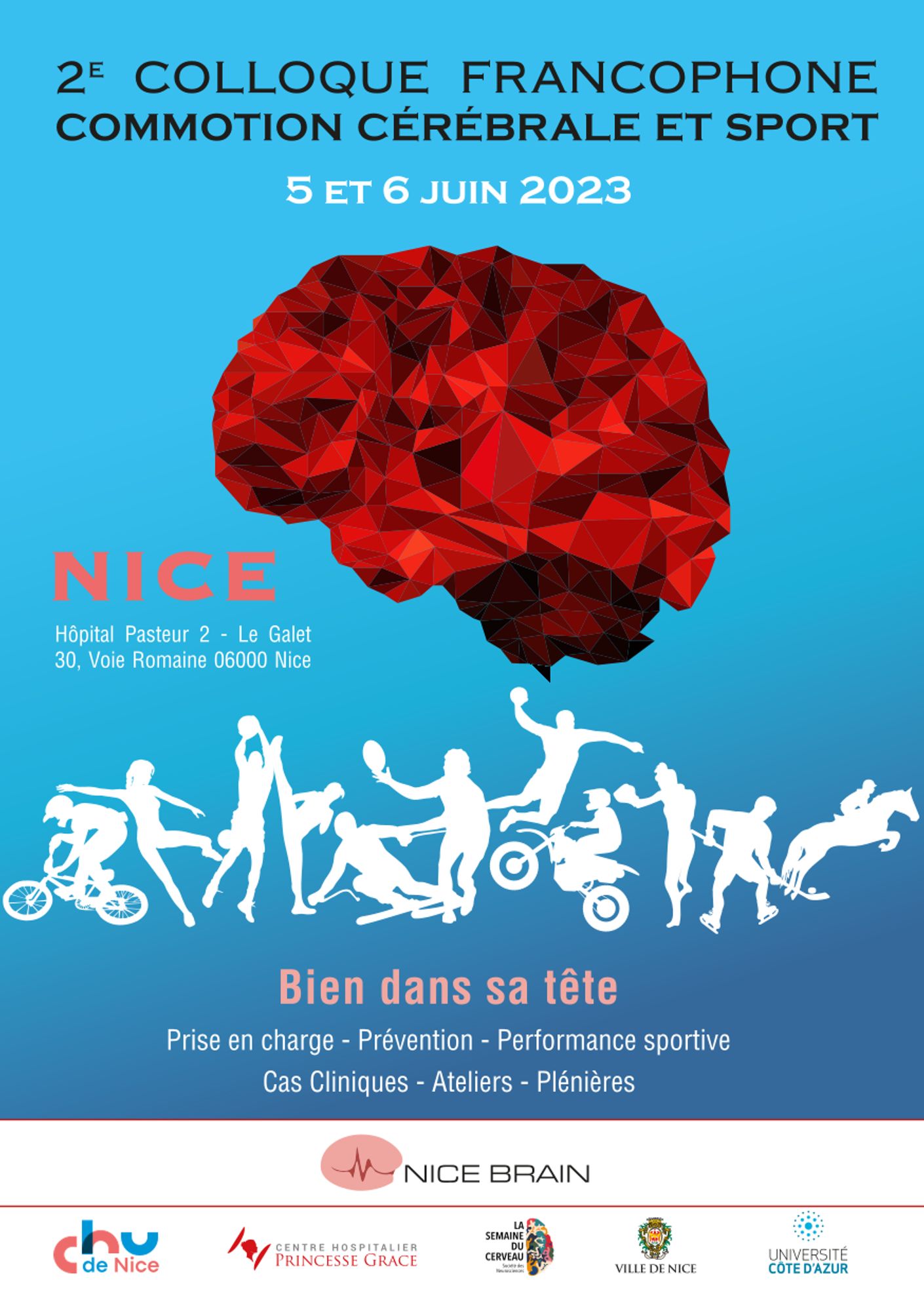 Le 2ème colloque Francophone commotion cérébrale et sport "Bien dans sa tête" aura lieu les 5 et 6 juin 2023 à Nice à l'Hôpital Pasteur 2 - Le Galet 30, Voie Romaine 06000 Nice.