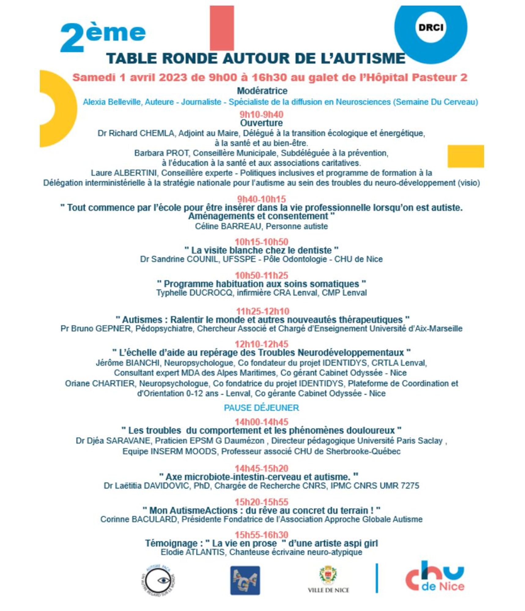 Le samedi 1 avril 2023 aura lieu au Galet de l’Hôpital Pasteur 2 de 9h00 à 16h45 " la 2ème table ronde autour de l’autisme " organisée au CHU de Nice. Cet évènement est co organisé par la DRCI du CHU de Nice et l’Association Approche Globale Autisme et est soutenu par la Ville de Nice et l’ association Autisme PACA dans le cadre de la journée mondiale de sensibilisation à l'autisme.