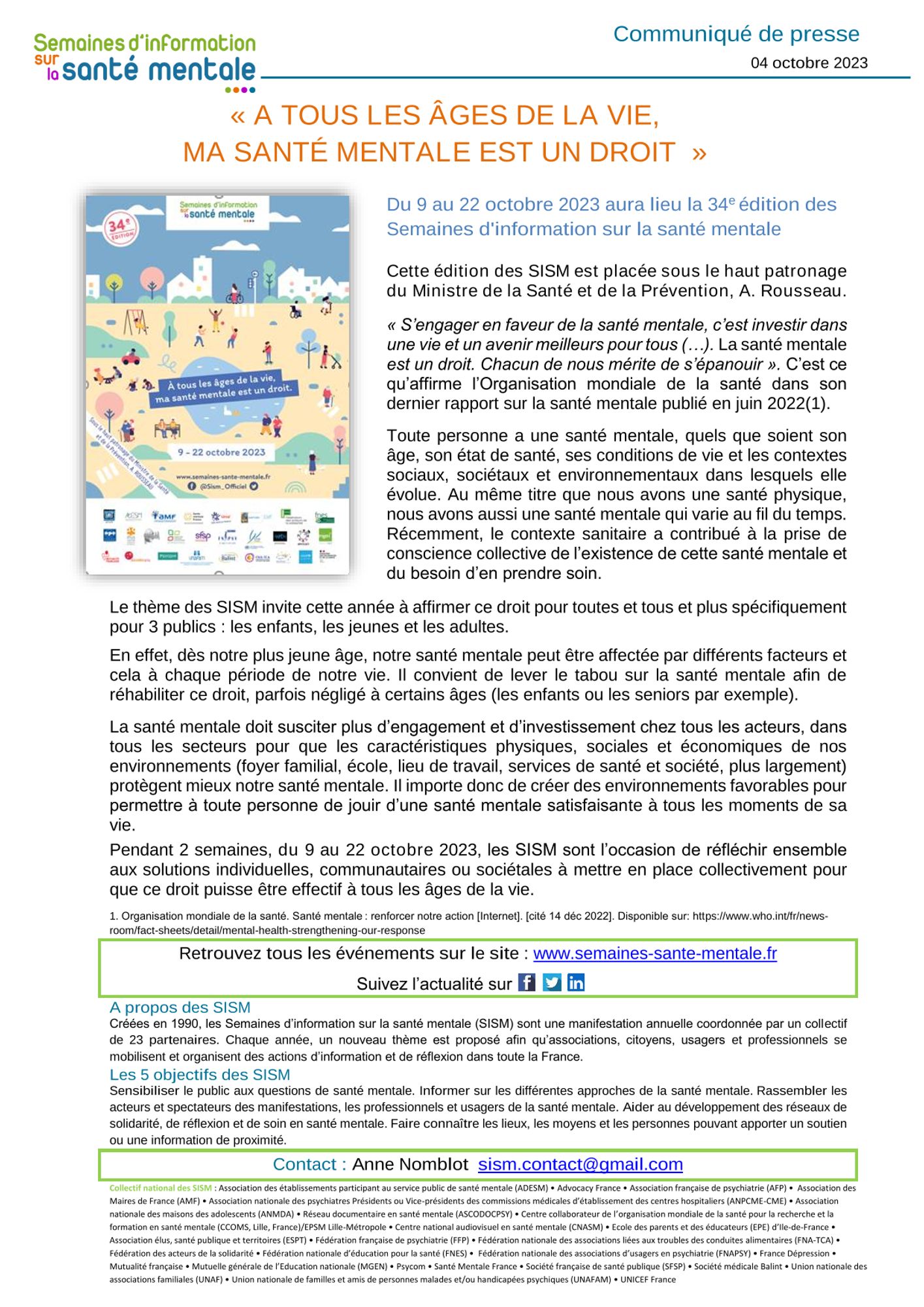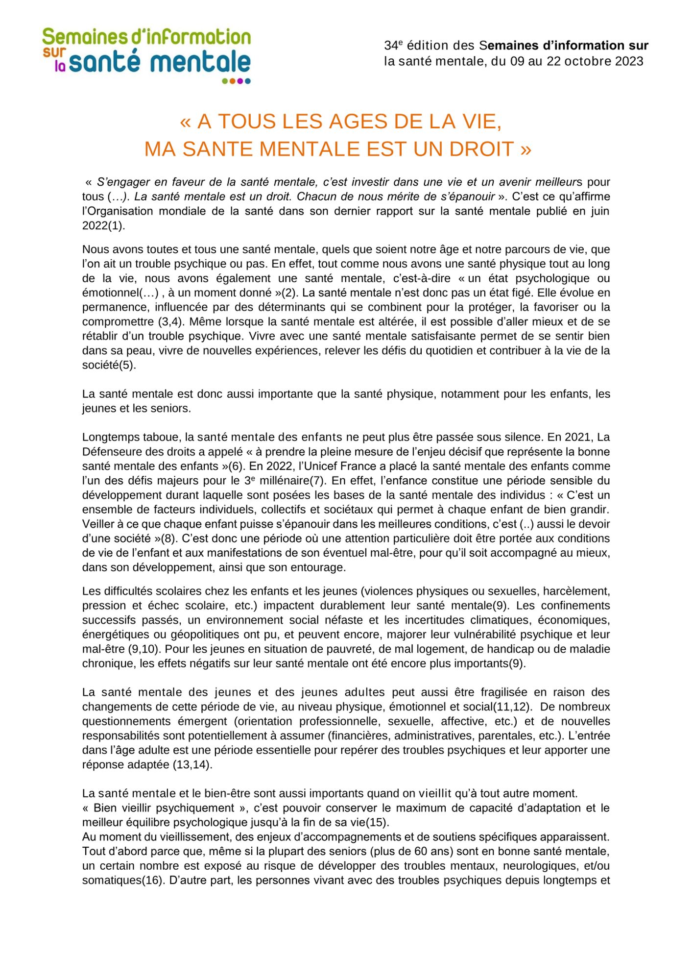 34e édition des Semaines d’information sur la santé mentale « A tous les âges de la vie, ma santé mentale est un droit »