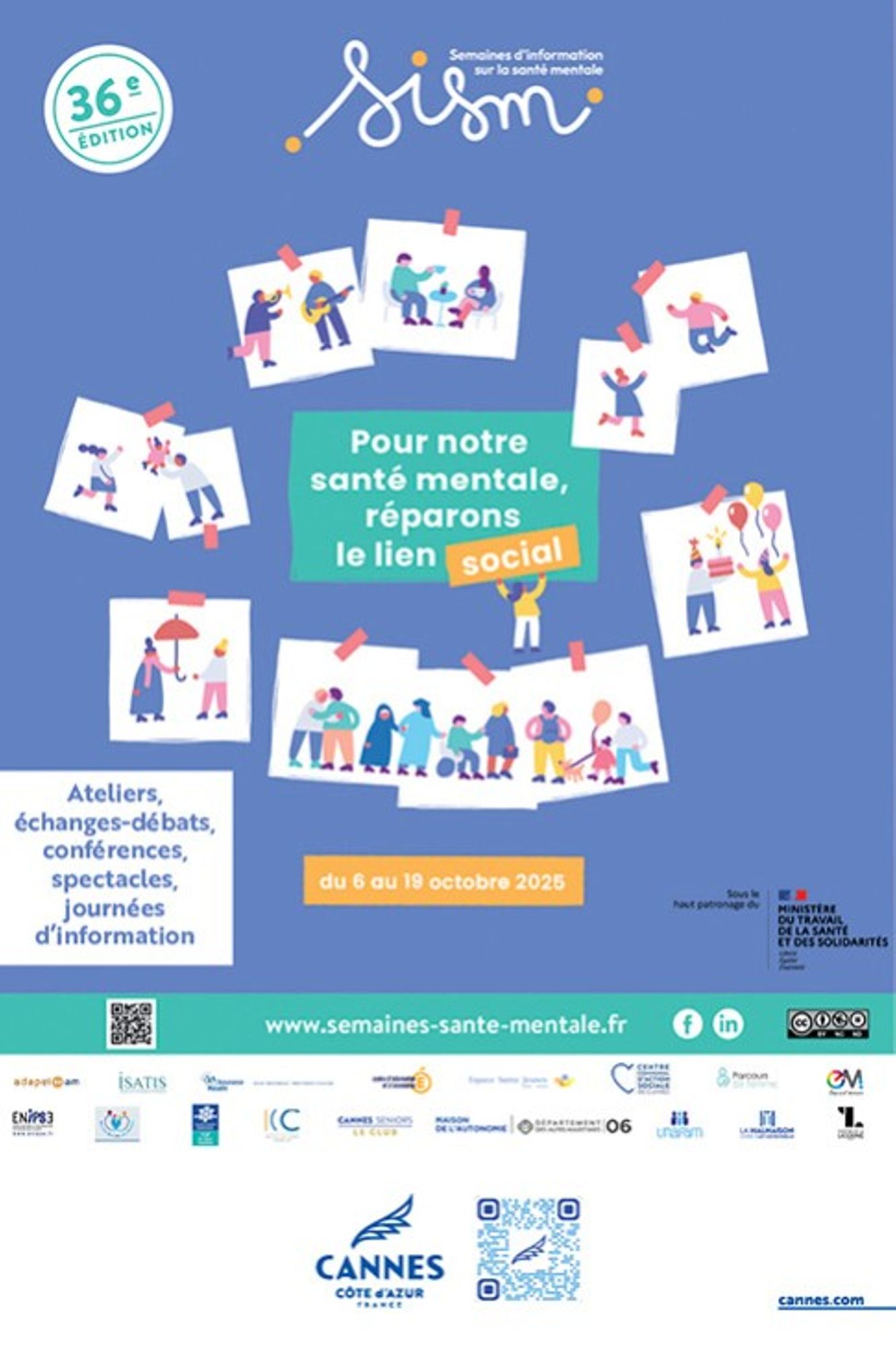 La 36ᵉ édition des Semaines d’information sur la santé mentale (SISM) se déroulera du 6 au 19 octobre 2025, sous le thème : "Pour notre santé mentale, réparons le lien social". Elle a pour objectif de sensibiliser le grand public à l’importance des relations humaines dans le bien-être psychologique, d’informer sur les ressources disponibles et de lutter contre la stigmatisation des troubles mentaux.
