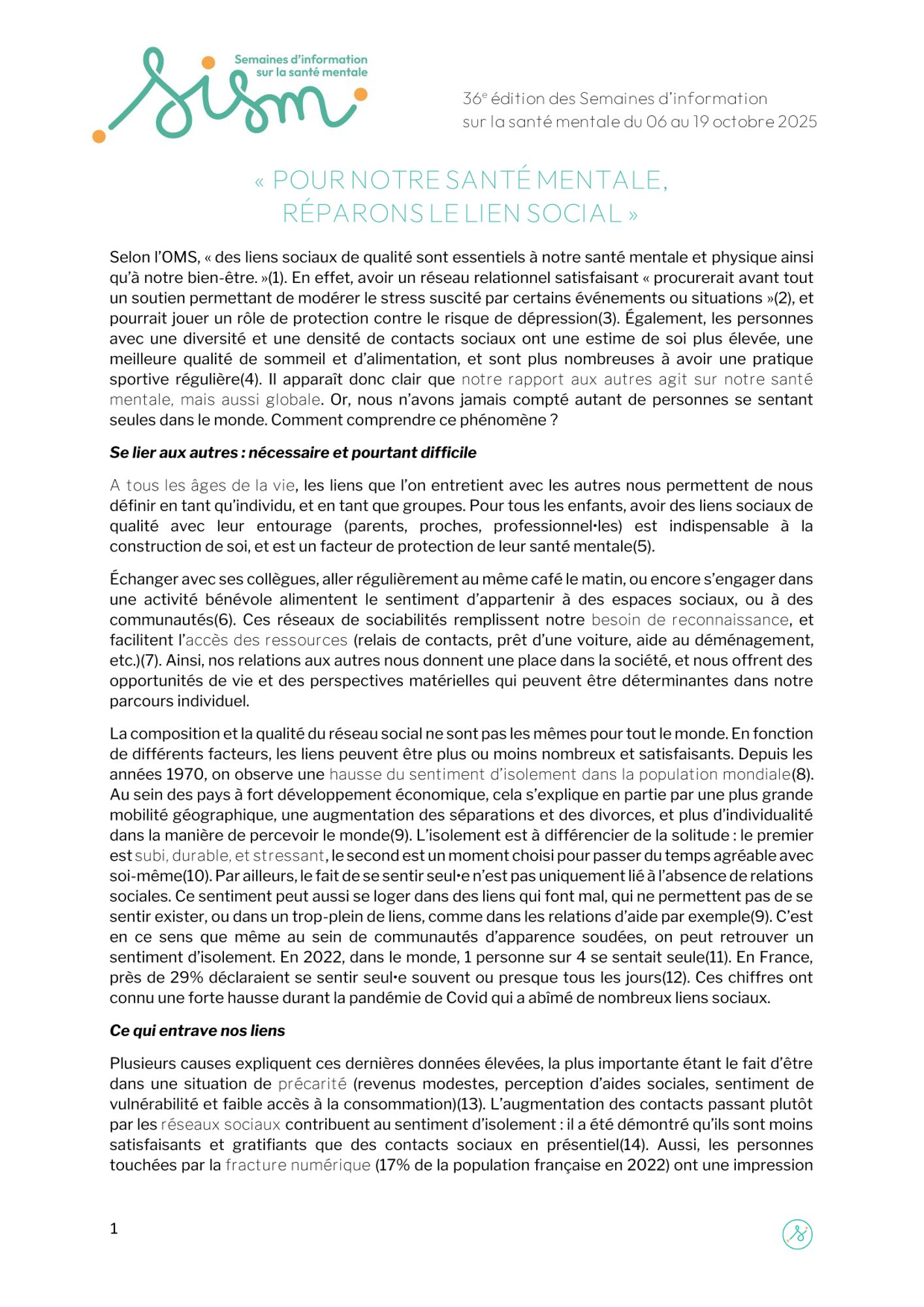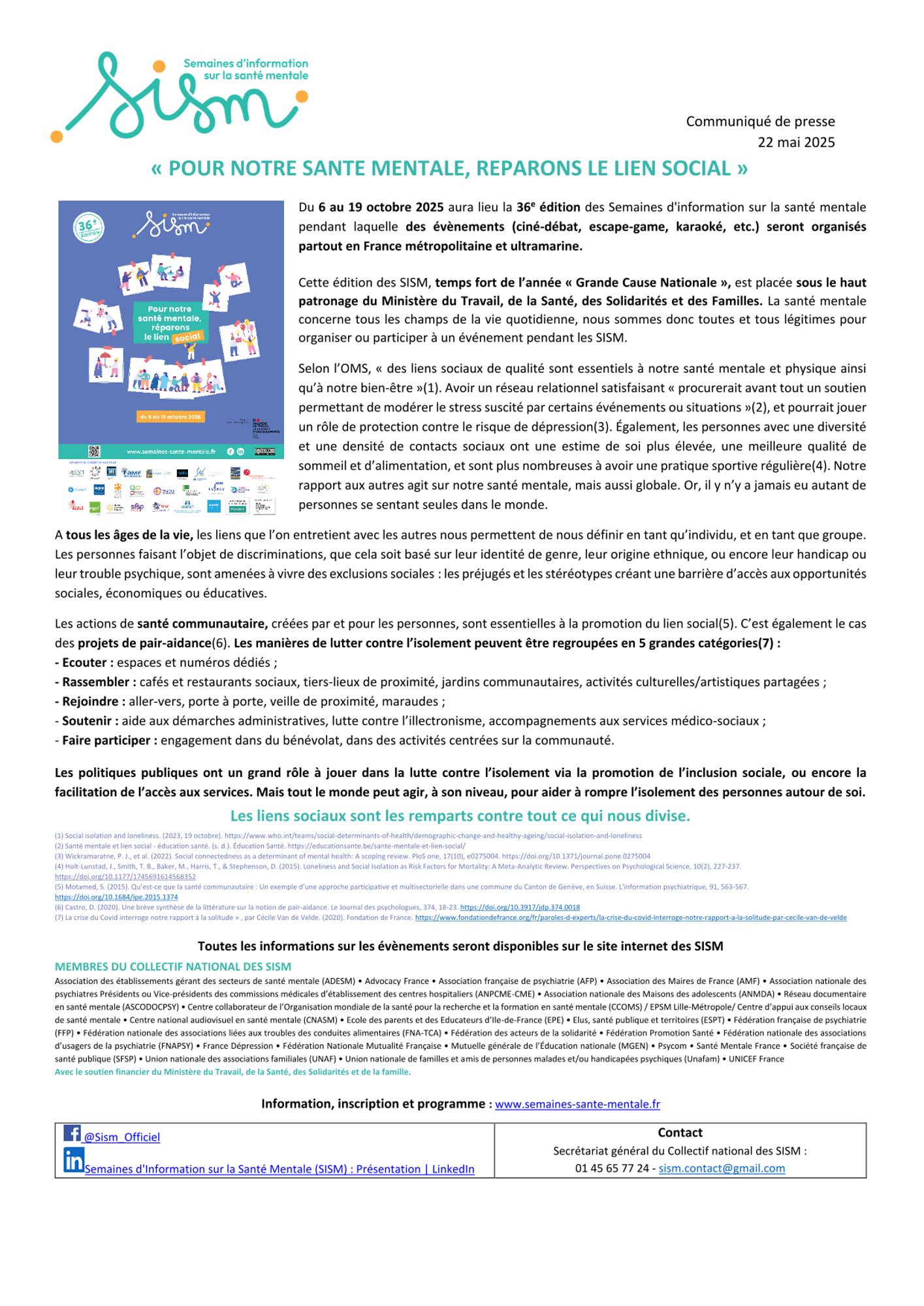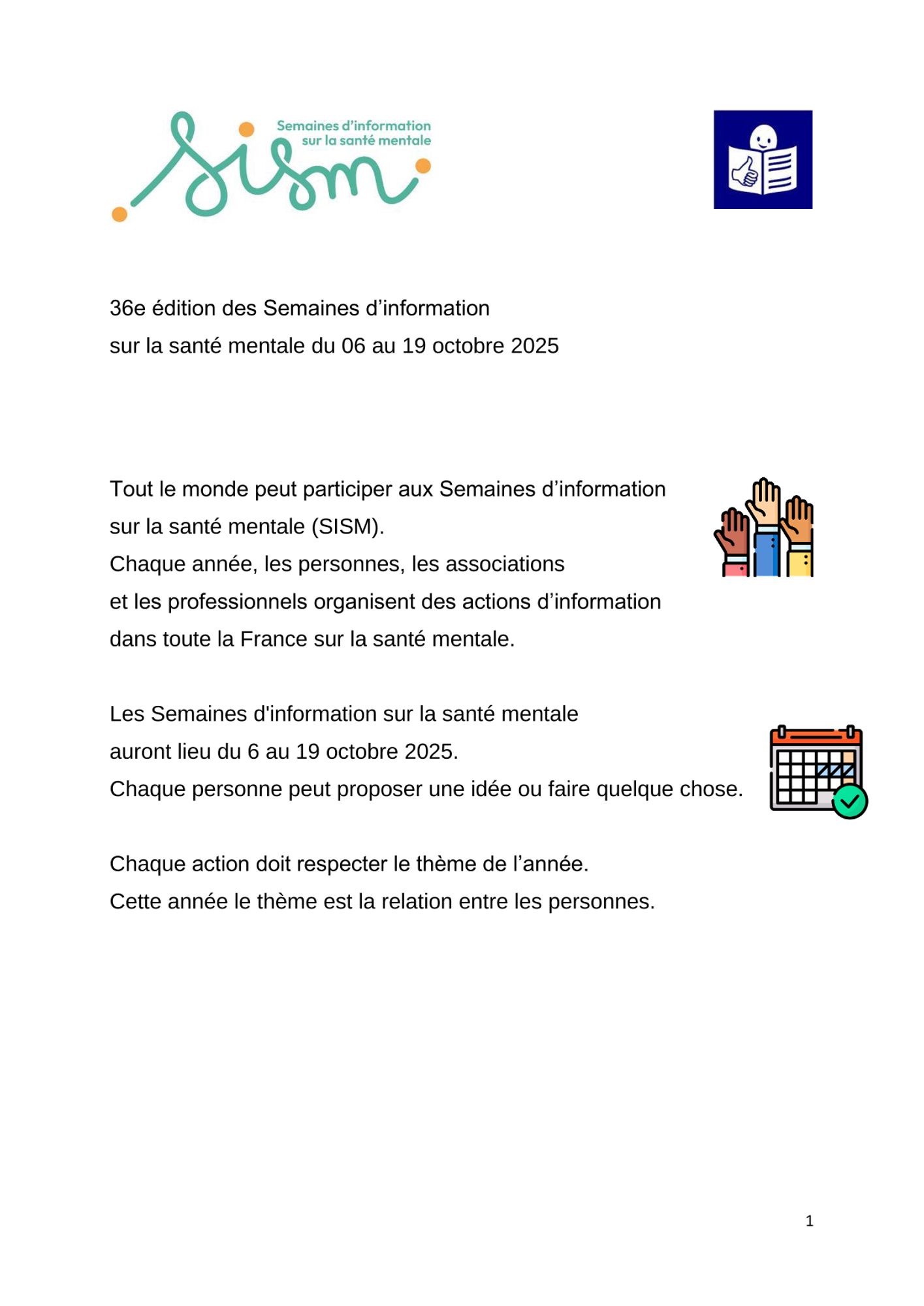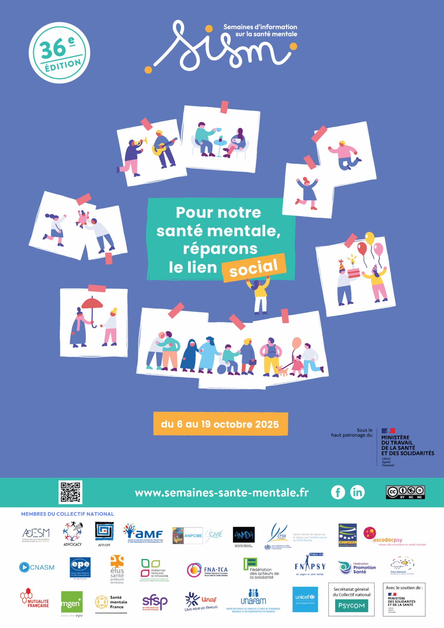 La 36ème édition des SISM aura lieu du 06 au 19 octobre 2025, autour de la thématique suivante : « Pour notre santé mentale, réparons le lien social ».