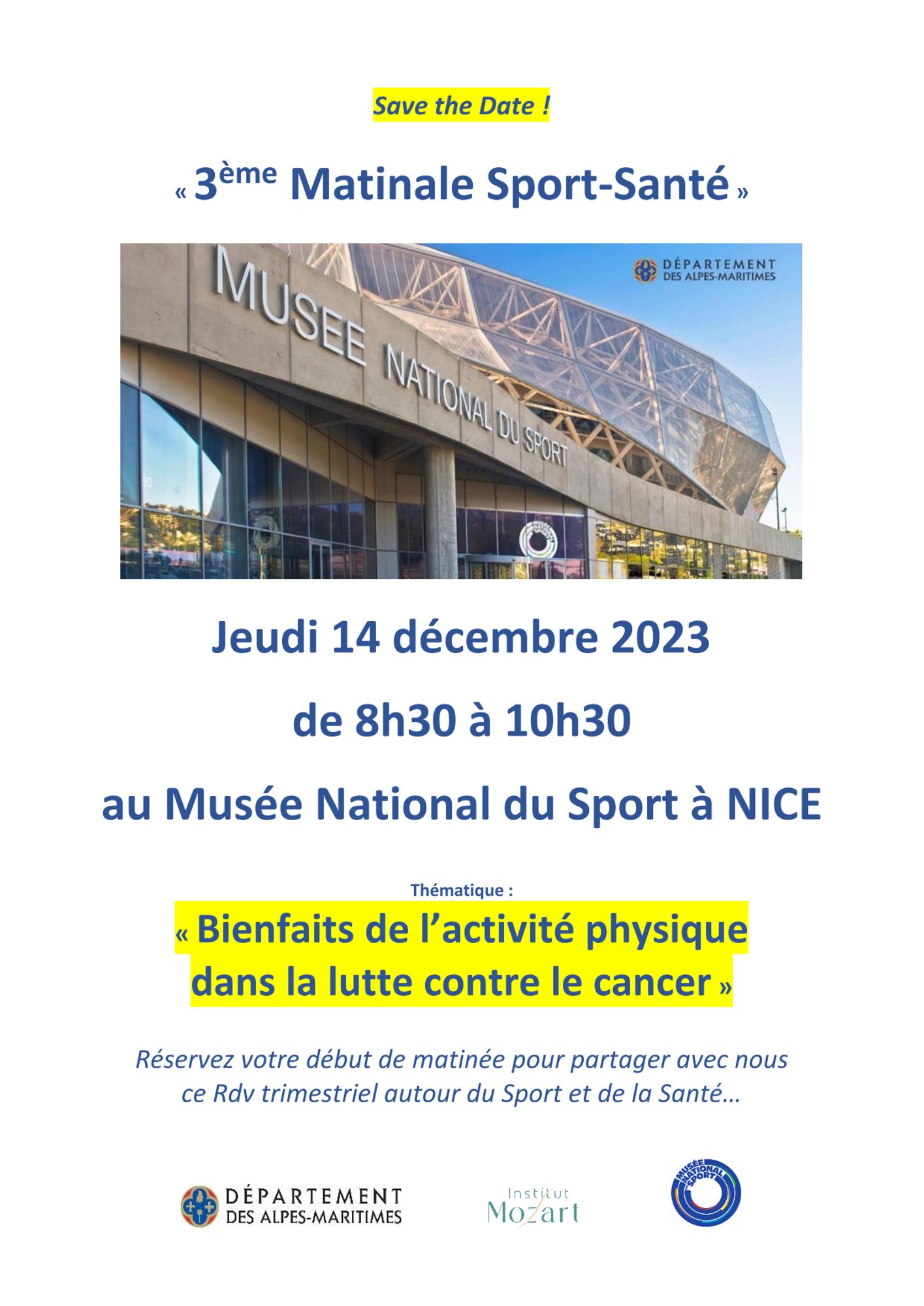 3ème Matinale sport santé Musée National du Sport - Département 06 - Institut Mozart - Le 14 décembre 2023 - Nice La 3ème « Matinale sport-santé » se déroulera le jeudi 14 décembre 2023, au Musée National du Sport à Nice de 8h30 à 10h30 ! La thématique abordée sera : « Bienfaits de l’activité physique dans la lutte contre le cancer ». Jeudi 14 décembre 2023