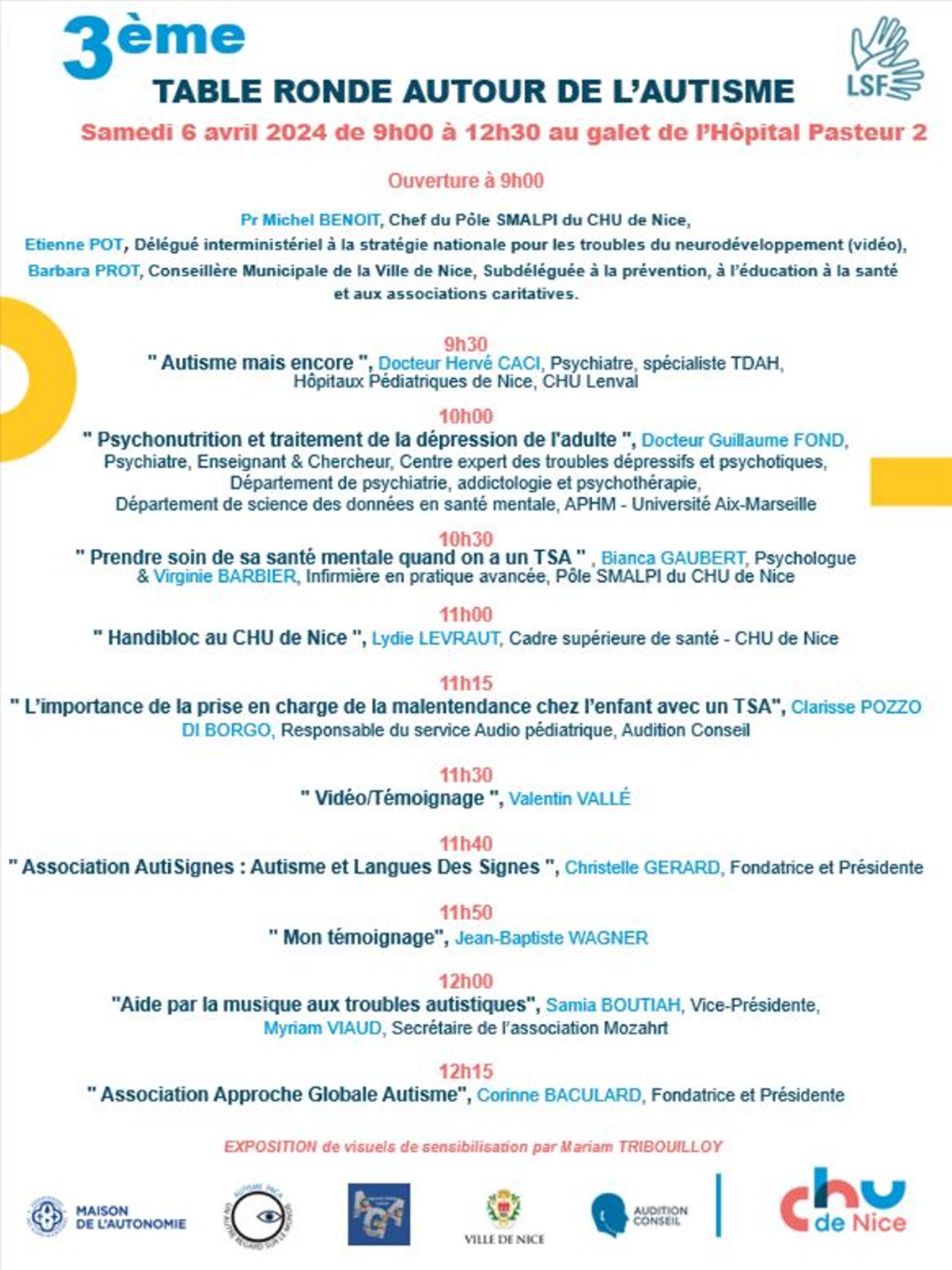 La 3ème table ronde autour de l'autisme se tiendra le samedi 06 Avril 2024 de 9h00 à 12h30, hôpital Pasteur 2 - Amphithéatre du Galet, organisée au CHU de Nice dans le cadre de la journée mondiale de sensibilisation à l’autisme. Cet évènement est co organisé par le Pôle SMALPI du CHU de Nice et l’Association Approche Globale Autisme et est soutenu par la Ville de Nice, l’association Autisme PACA, la Maison de l’Autonomie et Audition Conseil.