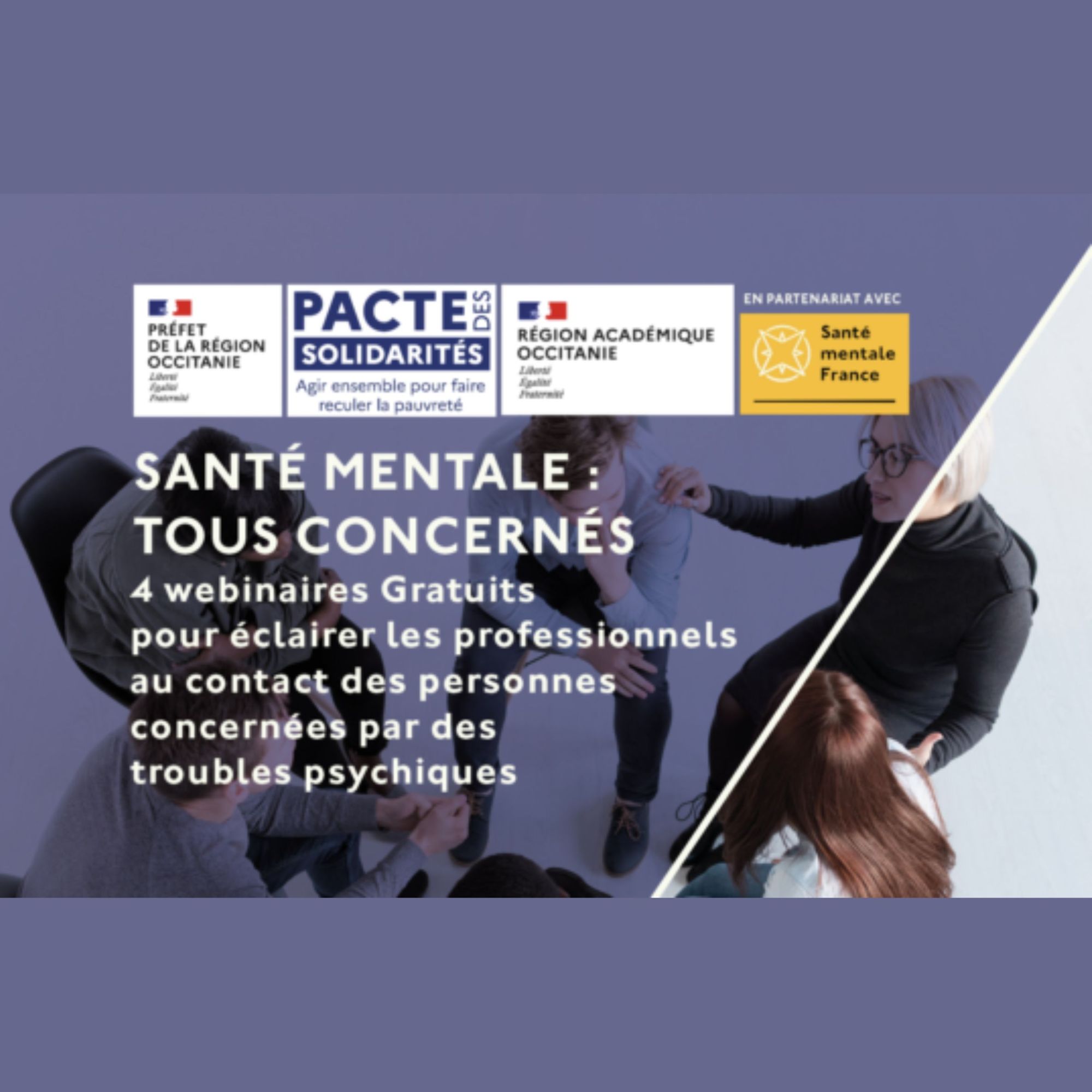 Pour éclairer les professionnels au contact des personnes concernées par les troubles psychiques, en partenariat avec la préfecture de la région Occitanie et la région Académique Occitanie, Santé mentale France propose 4 webinaires gratuits et ouverts à toutes et tous du 19 Septembre au 24 novembre 2024.