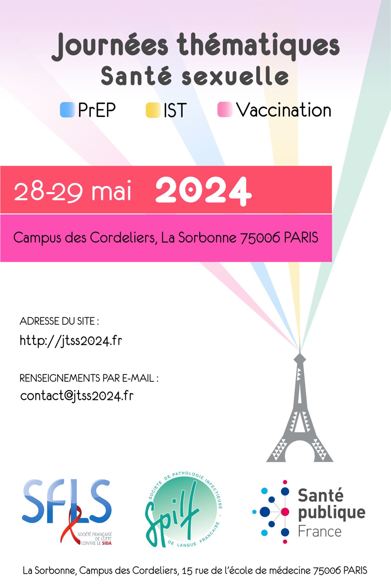 Les Journées Thématiques Santé Sexuelle 2024, orientées sur IST, PrEP et vaccination vous sont proposées par la SFLS (Société Française de Lutte contre le Sida), la SPILF (Société de Pathologie Infectieuse de Langue Française), et Santé Publique France, avec la participation des CSS et du RSSP pour l'élaboration du programme.