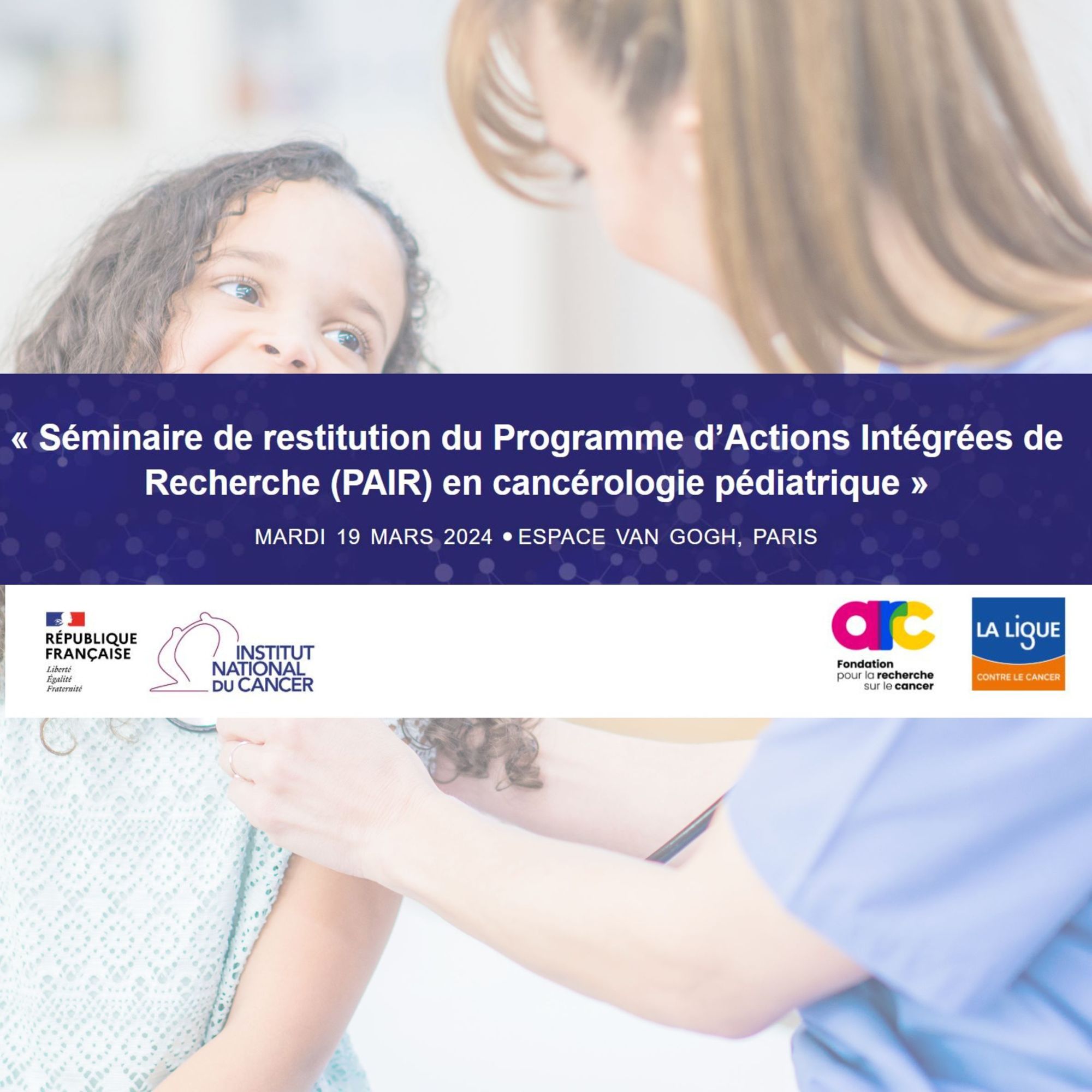 L’Institut national du cancer, la Ligue contre le cancer et la Fondation ARC organisent un séminaire de restitution du PAIR* Pédiatrie le mardi 19 mars 2024 à l’Espace Van Gogh à Paris.