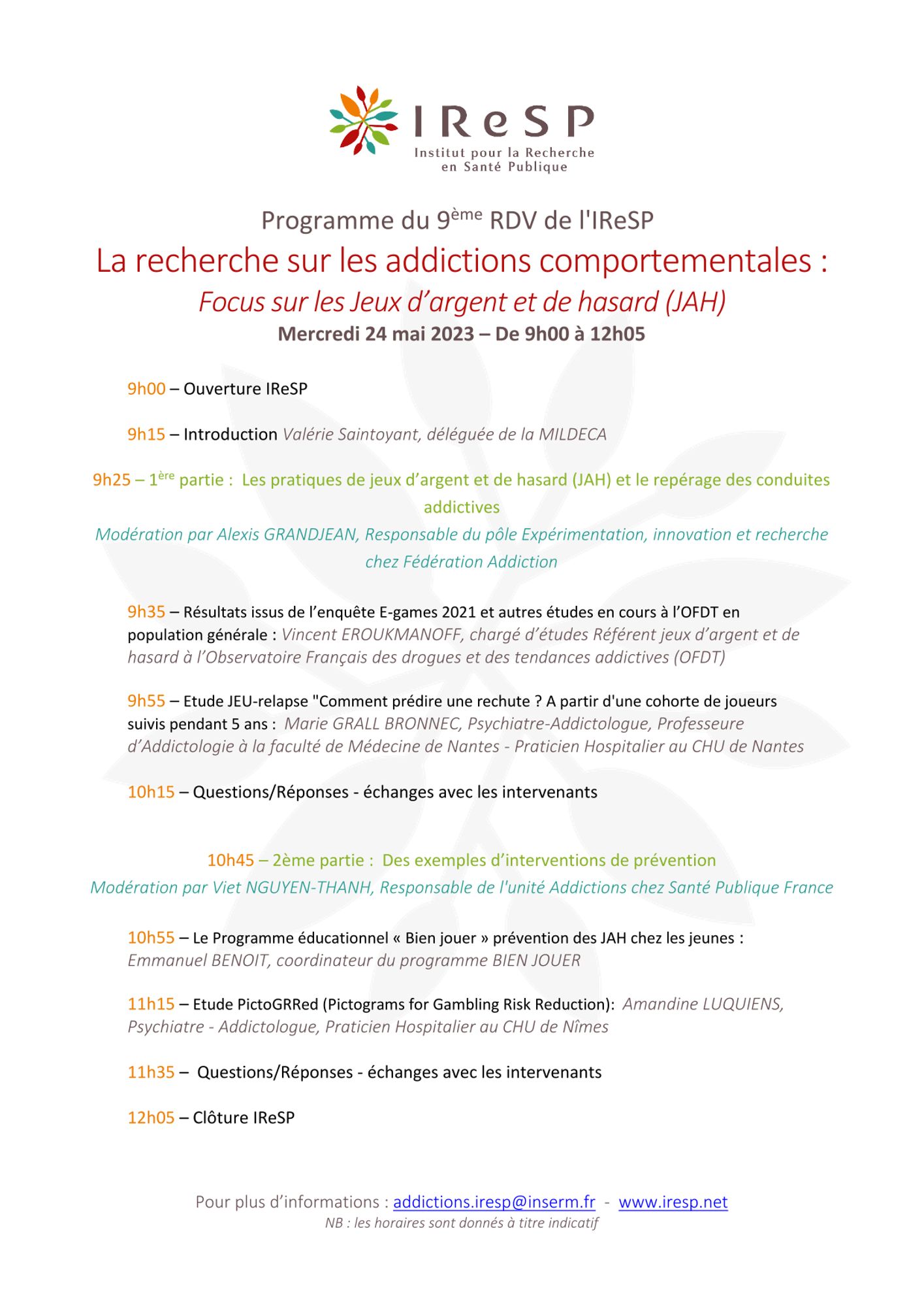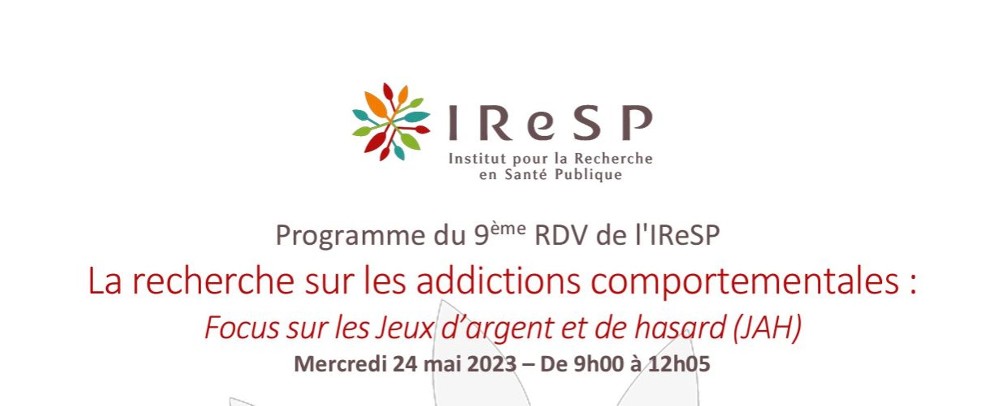 L’Institut pour la Recherche en Santé Publique (IReSP) vous invite au 9e Rendez-vous de l’IReSP « La recherche sur les addictions comportementales : focus sur les Jeux d’argent et de hasard (JAH) » qui se tiendra le mercredi 24 mai 2023 de 9h00 à 12h00 en visio-conférence.