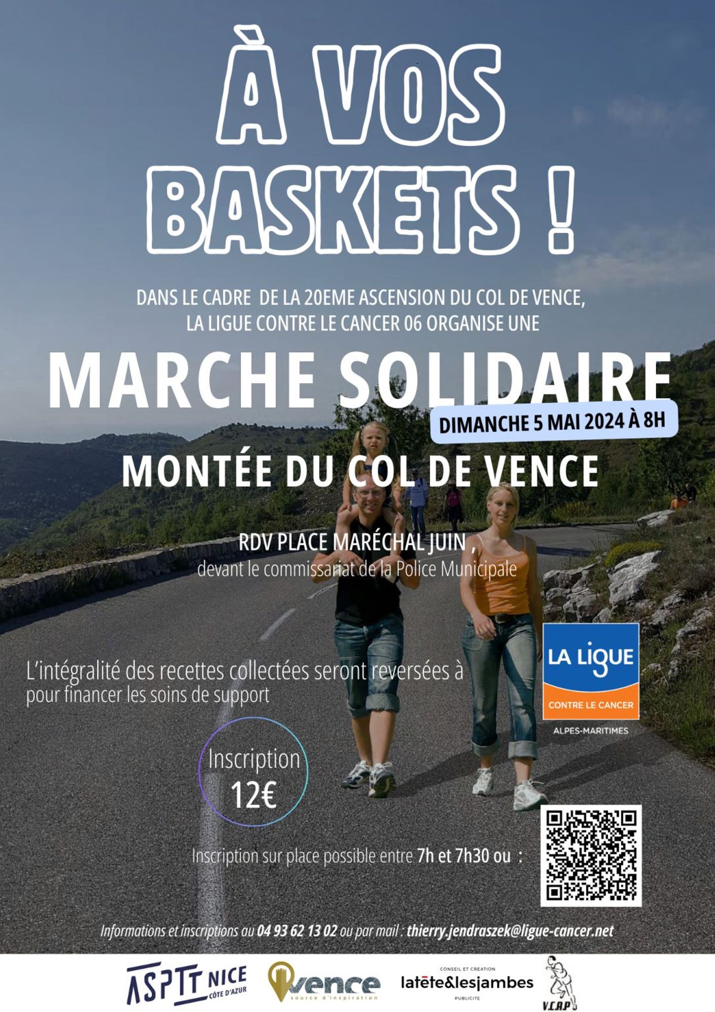 Dans le cadre de la 20ème ascension du col de Vence, la Ligue contre le Cancer 06 organise une marche solidaire "A vos baskets !", le dimanche 05 mai 2024 à 8h.