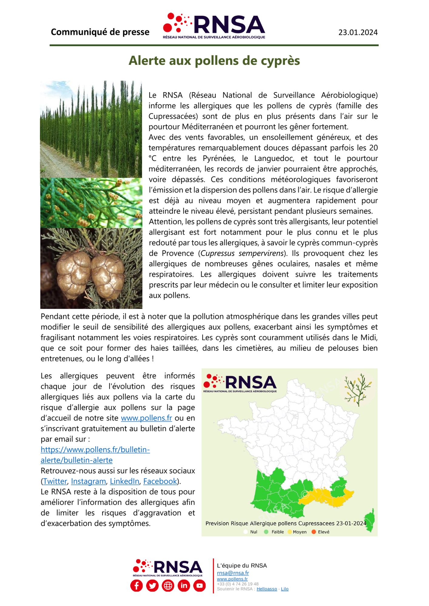 Le RNSA (Réseau National de Surveillance Aérobiologique) informe les allergiques que les pollens de cyprès (famille des Cupressacées) sont de plus en plus présents dans l’air sur le pourtour Méditerranéen et pourront les gêner fortement. Avec des vents favorables, un ensoleillement généreux, et des températures remarquablement douces dépassant parfois les 20 °C entre les Pyrénées, le Languedoc, et tout le pourtour méditerranéen, les records de janvier pourraient être approchés, voire dépassés. Ces conditions météorologiques favoriseront l’émission et la dispersion des pollens dans l’air. Le risque d’allergie est déjà au niveau moyen et augmentera rapidement pour atteindre le niveau élevé, persistant pendant plusieurs semaines. Attention, les pollens de cyprès sont très allergisants, leur potentiel allergisant est fort notamment pour le plus connu et le plus redouté par tous les allergiques, à savoir le cyprès commun-cyprès de Provence (Cupressus sempervirens). Ils provoquent chez les allergiques de nombreuses gênes oculaires, nasales et même respiratoires. Les allergiques doivent suivre les traitements prescrits par leur médecin ou le consulter et limiter leur exposition aux pollens. (Résumé éditeur)