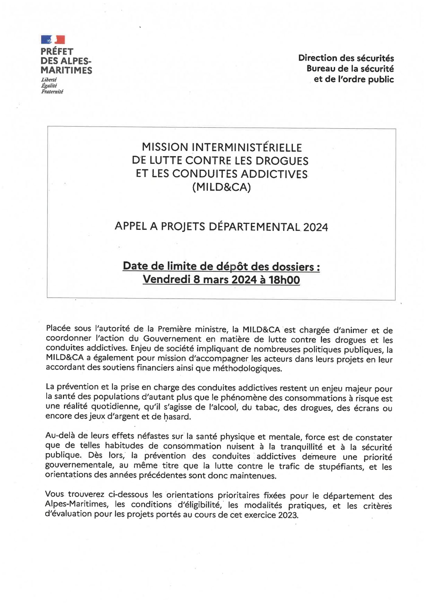 Veuillez trouver, ci-dessous, l'appel à projets départemental relatif à la MILDECA pour 2024.