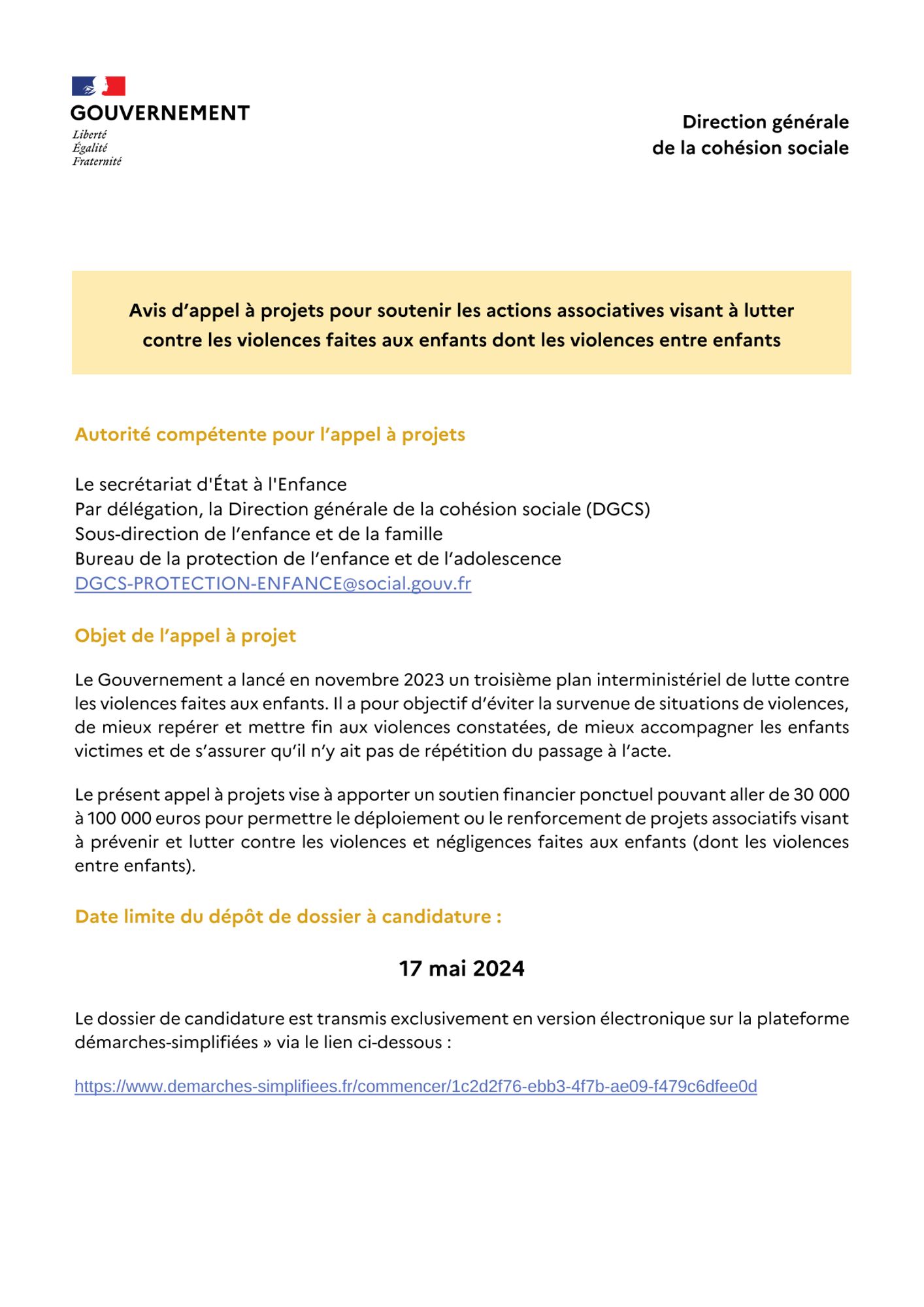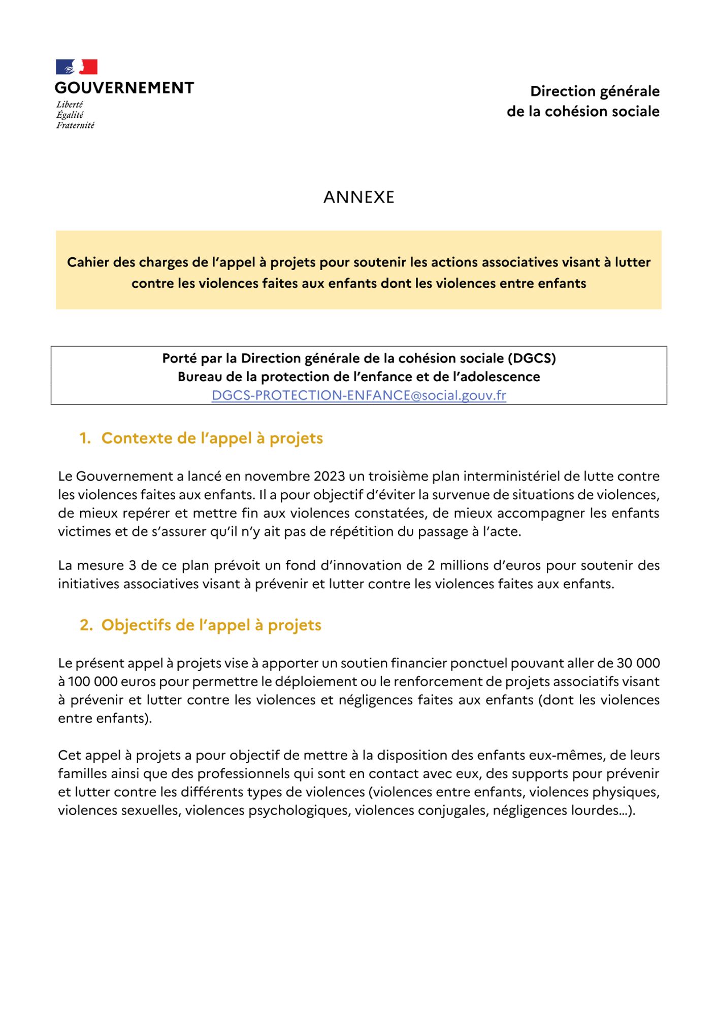 Le Gouvernement a lancé en novembre 2023 un troisième plan interministériel de lutte contre les violences faites aux enfants. Il a pour objectif d’éviter la survenue de situations de violences, de mieux repérer et mettre fin aux violences constatées, de mieux accompagner les enfants victimes et de s’assurer qu’il n’y ait pas de répétition du passage à l’acte. Le présent appel à projets vise à apporter un soutien financier ponctuel pouvant aller de 30 000 à 100 000 euros pour permettre le déploiement ou le renforcement de projets associatifs visant à prévenir et lutter contre les violences et négligences faites aux enfants (dont les violences entre enfants).