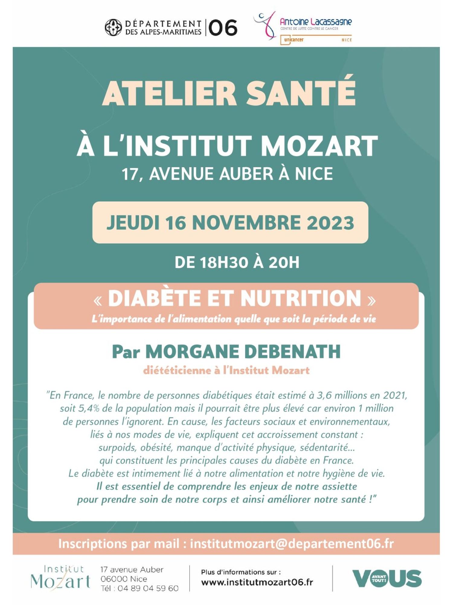 Pour ce 1er Rdv, à l'occasion de la Journée mondiale du diabète (le 14/11), le sujet qui sera traité par Morgane DEBENATH, diététicienne à l'Institut Mozart, sera : "Diabète et nutrition : l'importance de l'alimentation quelle que soit la période de vie".