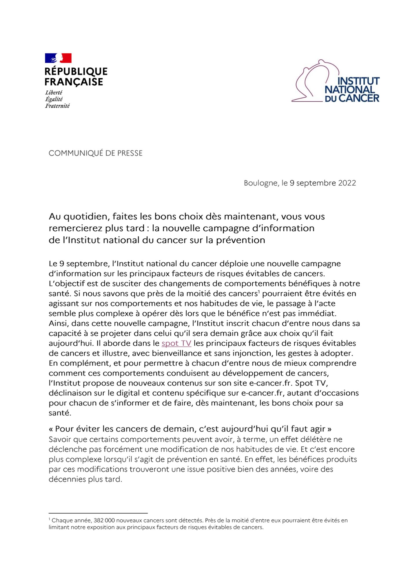 la nouvelle campagne d’information de l’Institut national du cancer sur la prévention. 2022