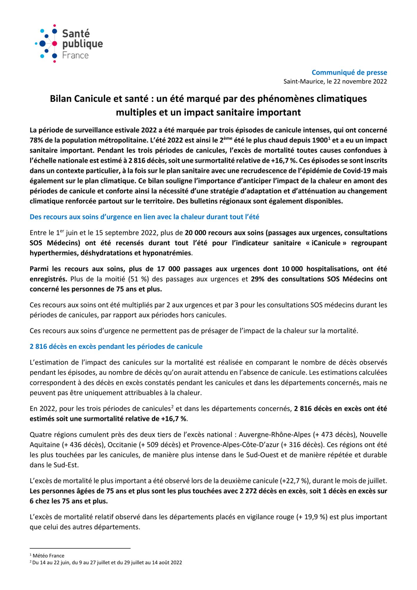 Quatre régions cumulent près des deux tiers de l’excès national : Auvergne-Rhône-Alpes (+ 473 décès), Nouvelle Aquitaine (+ 436 décès), Occitanie (+ 509 décès) et Provence-Alpes-Côte-D’azur (+ 316 décès). Ces régions ont été les plus touchées par les canicules, de manière plus intense dans le Sud-Ouest et de manière répétée et durable dans le Sud-Est.