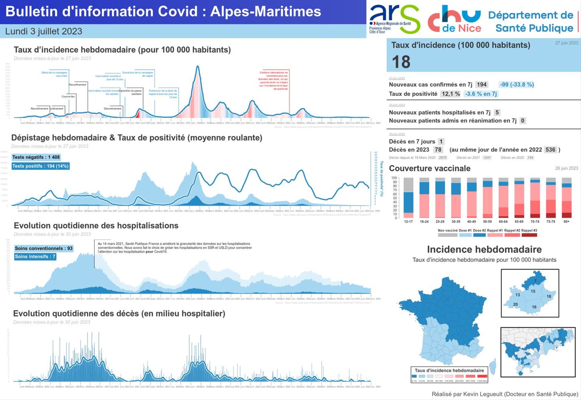 Depuis 2020, en collaboration avec la Délégation Territoriale des Alpes-Maritimes de l’ARS PACA, nous avons réalisé chaque semaine un bulletin épidémiologique Covid-19, afin de vous présenter les indicateurs clefs pour notre département.