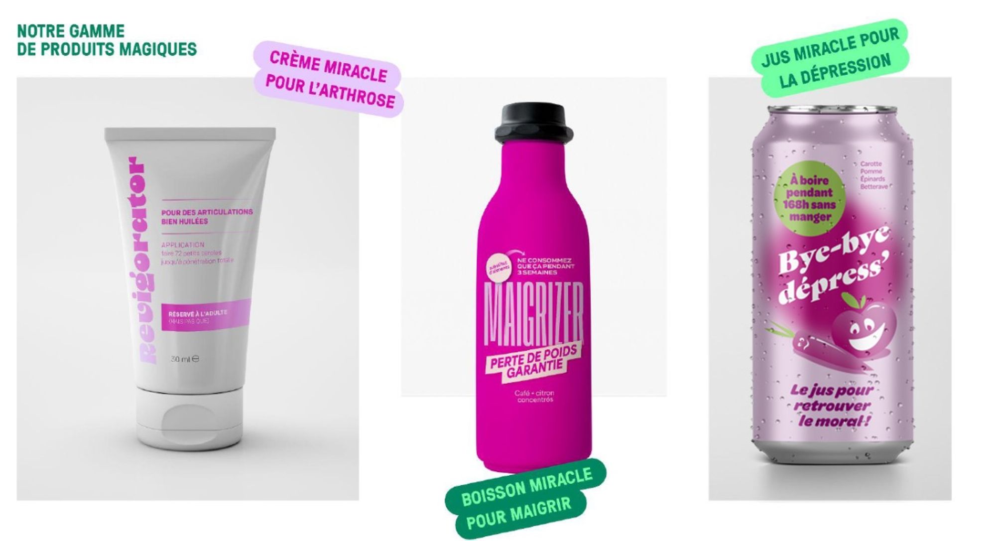 Les vrais-faux produits conçus par l’Inserm dans le cadre de sa nouvelle campagne grand public : Revigorator, la crème pour des articulations bien huilées – Conseils d’utilisation : faire 72 petits cercles jusqu’à pénétration totale; Maigrizer, la boisson perte de poids perte de poids garantie – Ne consommer que cela pendant 3 semaines; Bye-bye dépress’, le jus pour retrouver le moral – À consommer pendant 168 heures à jeun.