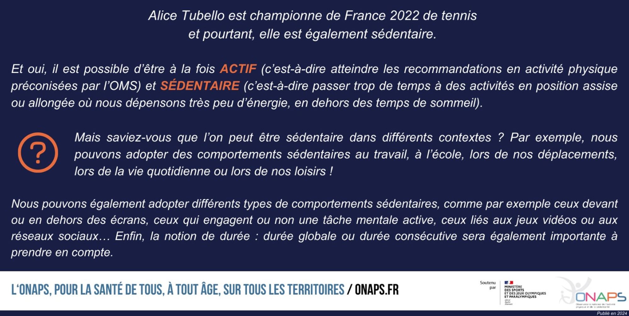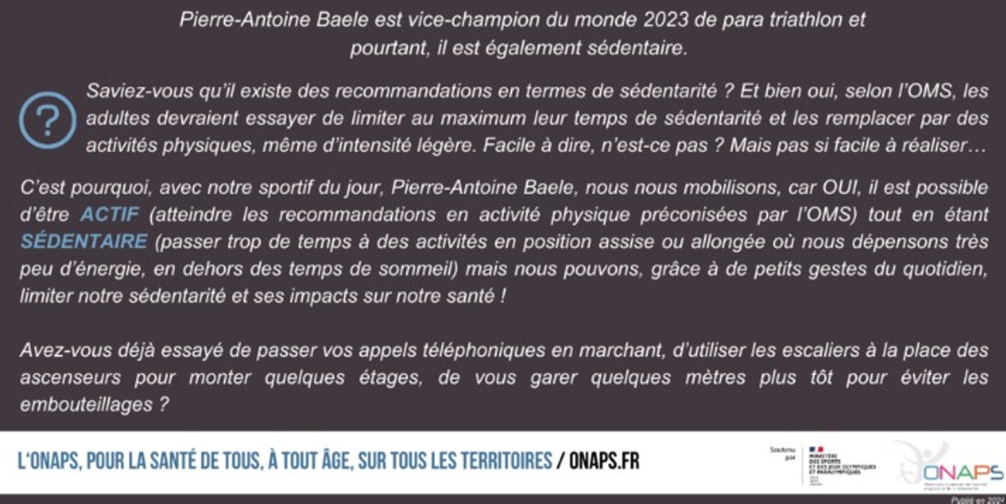 A moins de deux mois des Jeux Olympiques et Paralympiques de Paris 2024, l’Observatoire national de l’activité physique et de la sédentarité lance une campagne nationale grand public pour sensibiliser la population à la sédentarité et à ses impacts sanitaires. Plusieurs sportifs aux palmarès remarquables se sont prêtés au jeu et se sont mis en scène eux-mêmes pour mettre leur notoriété au service de la prévention santé.