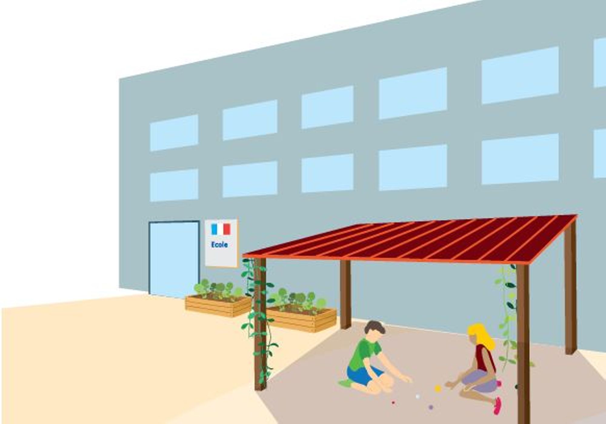 - Améliorer la structure et l’aménagement des bâtiments (végétalisation, préau ombragé, isolation des classes, stores, matériaux absorbant peu la chaleur, perméabilisation/déminéralisation des sols, jeux d’eau...)