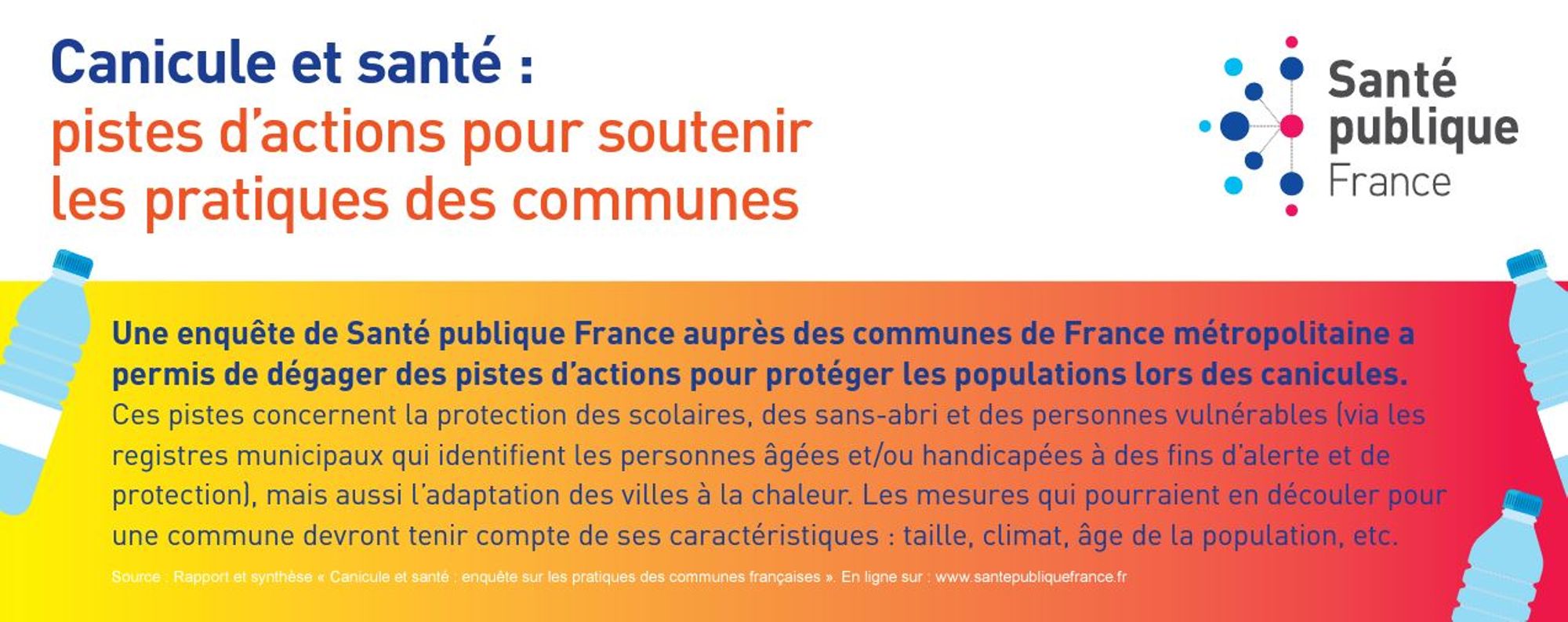 Santé publique France publie les résultats d’une enquête visant à connaître les pratiques des communes en matière de prévention contre les effets des canicules sur la santé des habitants. Plusieurs pistes sont proposées visant à soutenir l’action des communes.