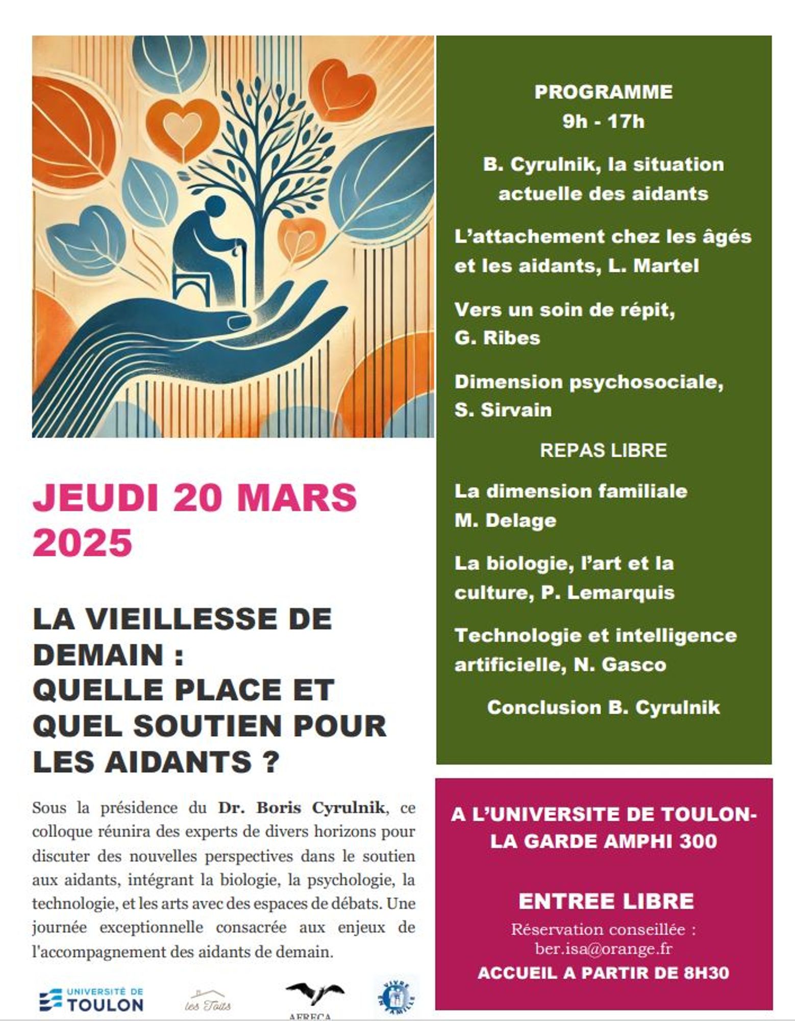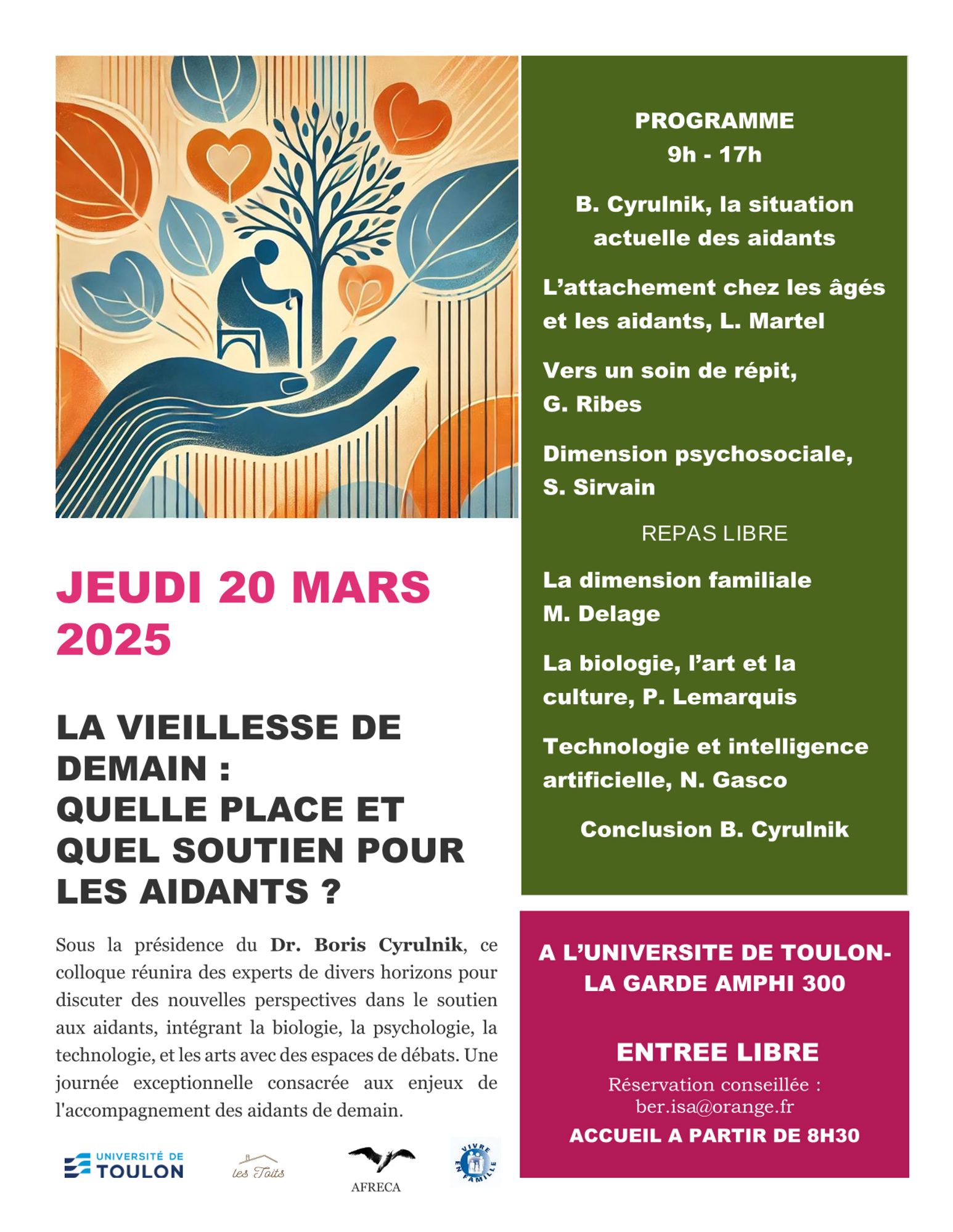 Sous la présidence du Dr. Boris Cyrulnik, ce colloque se déroulera le JEUDI 20 MARS 2025, réunira des experts de divers horizons pour discuter des nouvelles perspectives dans le soutien aux aidants, intégrant la biologie, la psychologie, la technologie, et les arts avec des espaces de débats. Une journée exceptionnelle consacrée aux enjeux de l'accompagnement des aidants de demain.