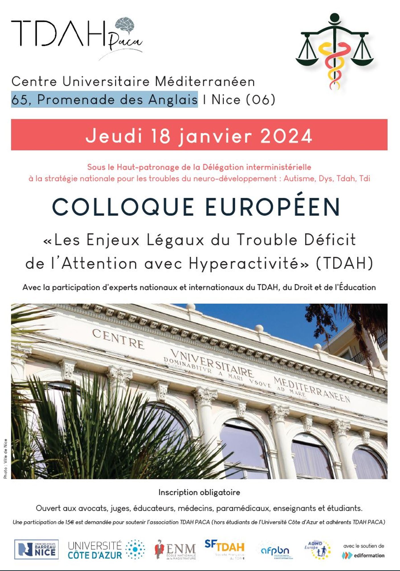 Une participation de 15€ est demandée pour soutenir l'association TDAH PACA (hors étudiants de l'Université Côte d'Azur et adhérents TDAH PACA)
