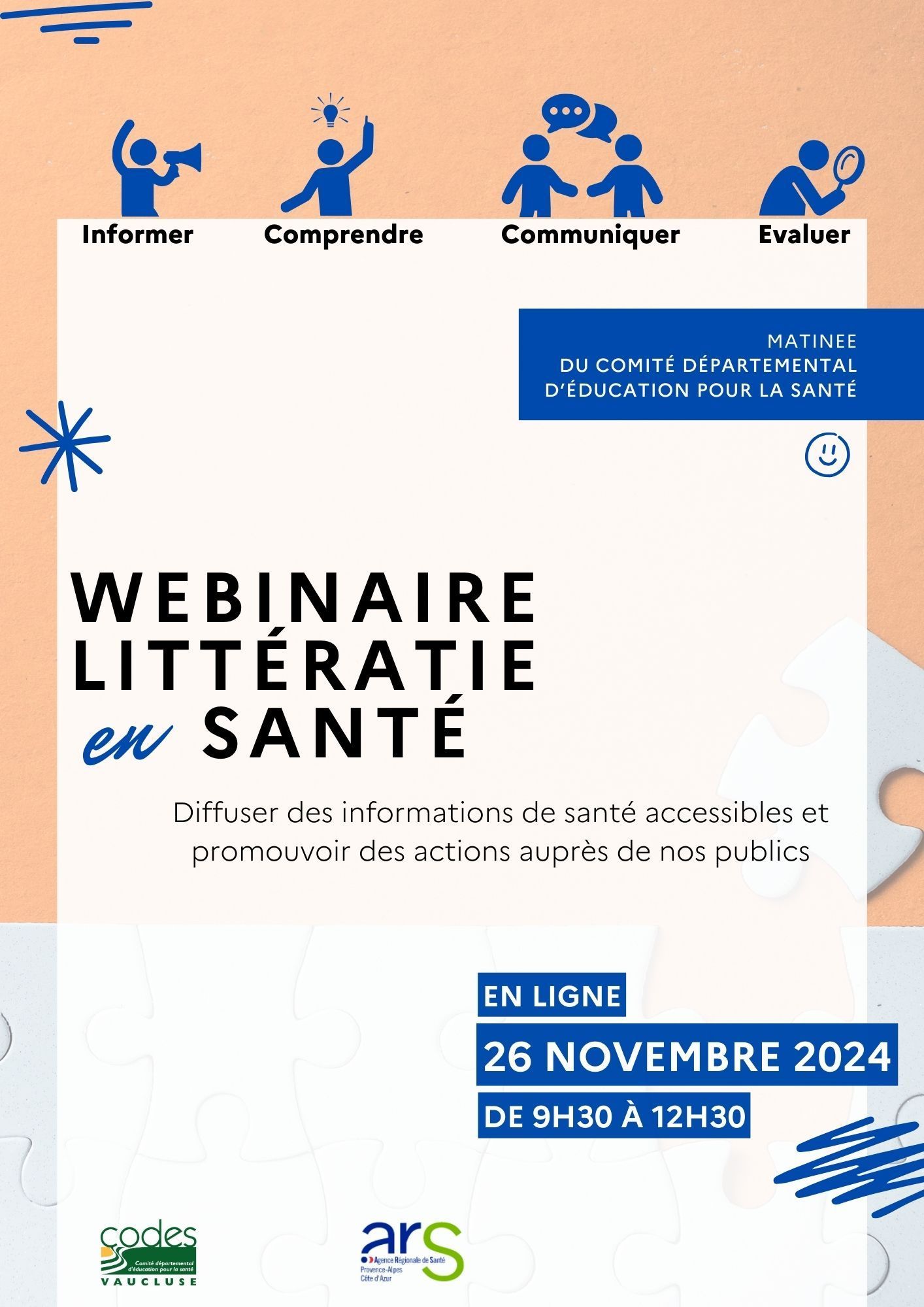 Le CODES 84 organise le 26 novembre 2024 un colloque sur la "Littératie en santé : Diffuser des informations de santé accessibles et promouvoir des actions auprès de nos publics.