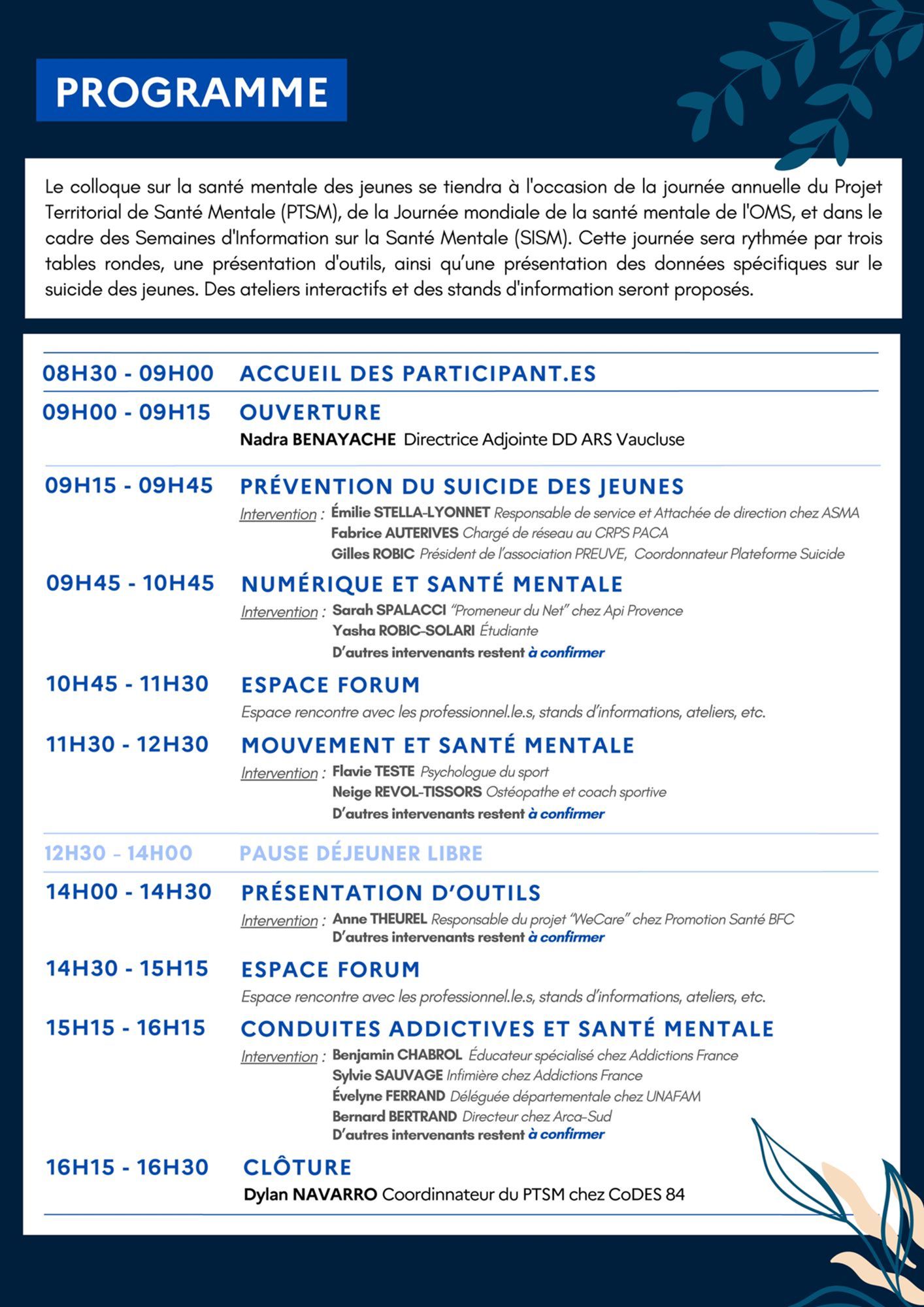Le colloque sur la santé mentale des jeunes se tiendra à l'occasion de la journée annuelle du Projet Territorial de Santé Mentale (PTSM), de la Journée mondiale de la santé mentale de l'OMS et dans le cadre des Semaines d'information sur la Santé Mentale (SISM). Cette journée sera rythmée par trois tables rondes, une présentation d'outils, ainsi qu'une présentation des données spécifiques sur le suicide des jeunes. Des ateliers interactifs et des stands d'information seront proposés.