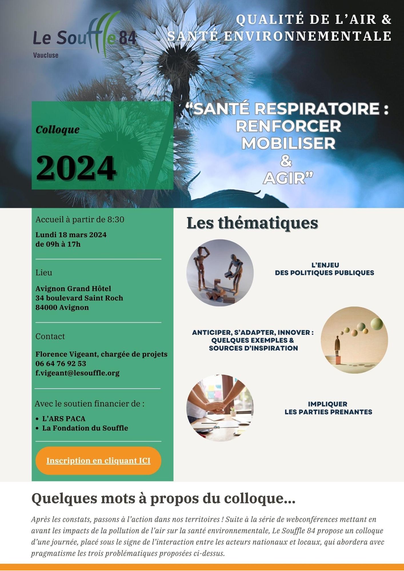 Suite à une série de webconférences mettant en avant les impacts de la pollution de l'air sur la santé environnementale, le Souffle 84 propose un colloque d'une journée, placé sous le signe de l'interaction entre les acteurs nationaux et locaux, qui abordera avec pragmatisme les thématiques ci-dessous :