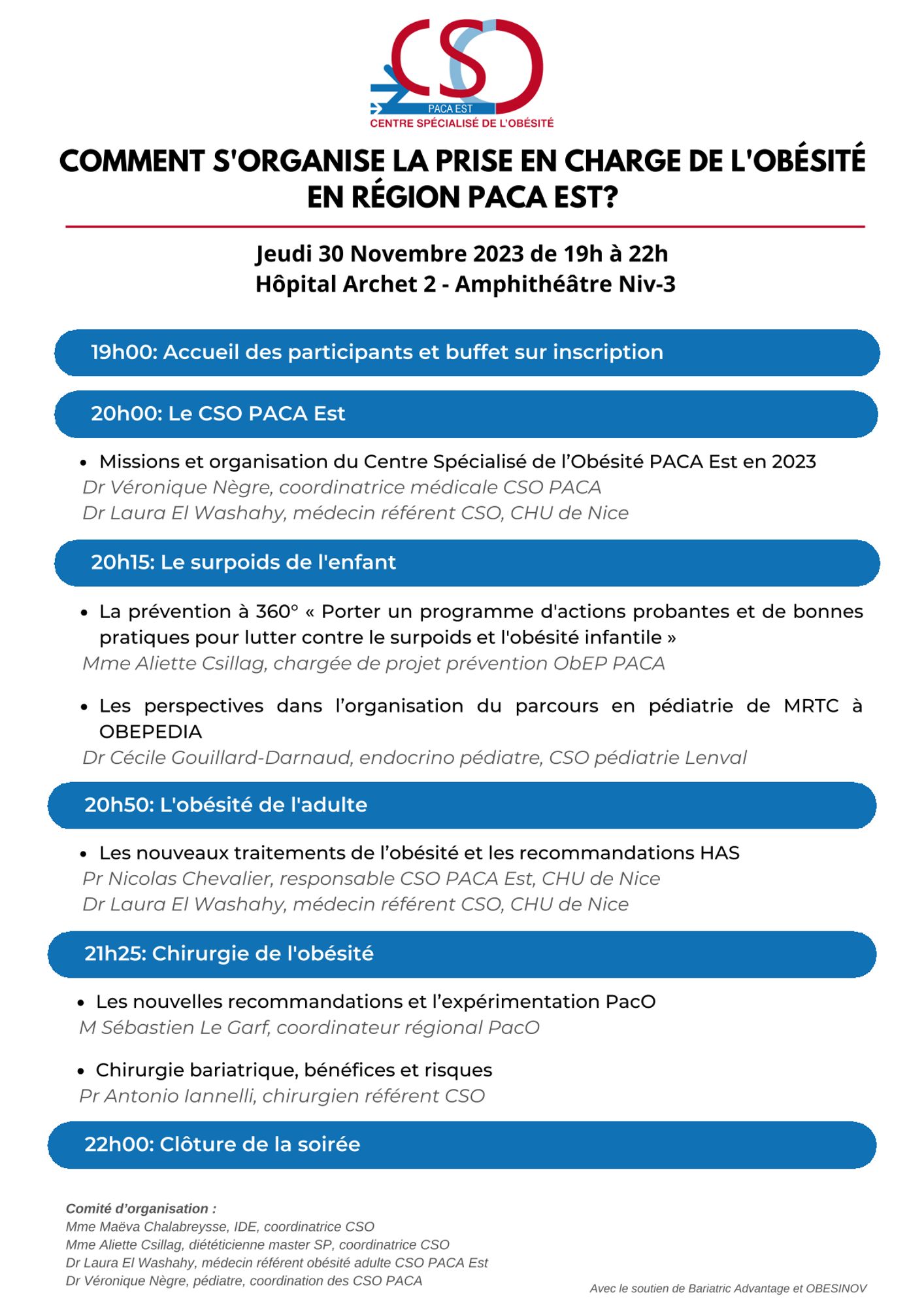 Le Centre Spécialisé de l'Obésité PACA Est vous convie à une soirée d'informations et d'échanges sur la prise en charge de l'obésité. Cette soirée aura lieu le :