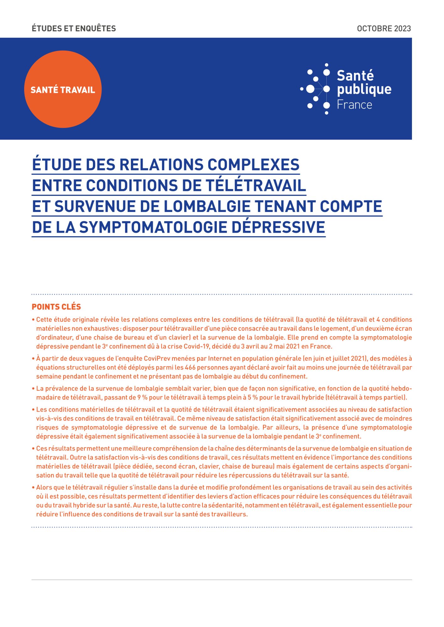 Ces résultats, obtenus lors du 3e confinement, permettent une meilleure compréhension de la chaîne des déterminants de la survenue de lombalgie en situation de télétravail, bien qu’il soit nécessaire de poursuivre ces travaux avec l’inscription du télétravail dans les organisations de travail sur le long terme. Ils mettent notamment en évidence l’importance des conditions matérielles de télétravail (pièce dédiée, second écran, clavier, chaise de bureau) mais également de certains aspects d’organisation du travail, telle que la quotité de télétravail hebdomadaire, pour réduire les répercussions du télétravail sur la santé.
