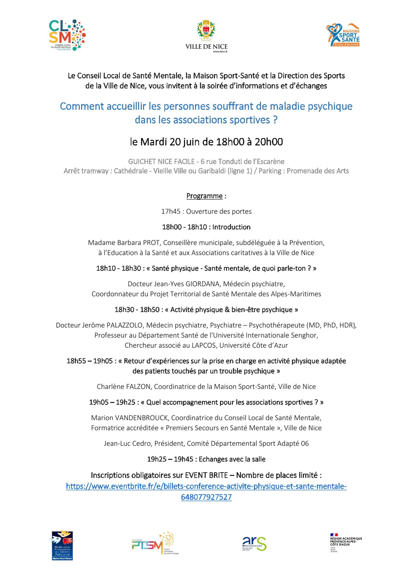 Le Conseil Local de Santé Mentale, la Maison Sport-Santé et la Direction des Sports de la Ville de Nice, vous invitent à la soirée d’informations et d’échanges
