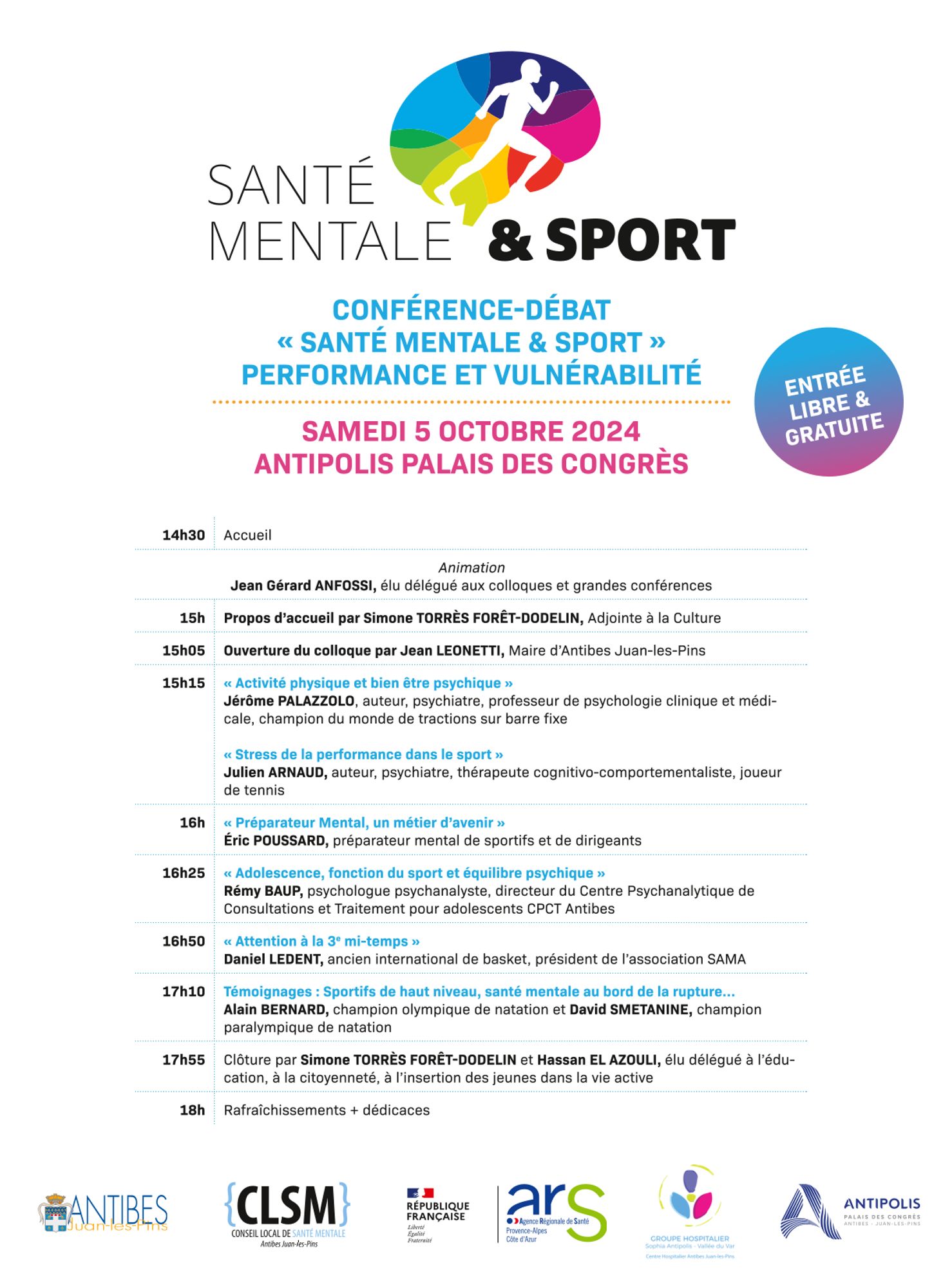 La Conférence-débat CLSM « Santé Mentale et Sport » - Vulnérabilité et performance- aura lieu : le samedi 5 octobre à 15h au Palais des Congrès à Juan-les-Pins.