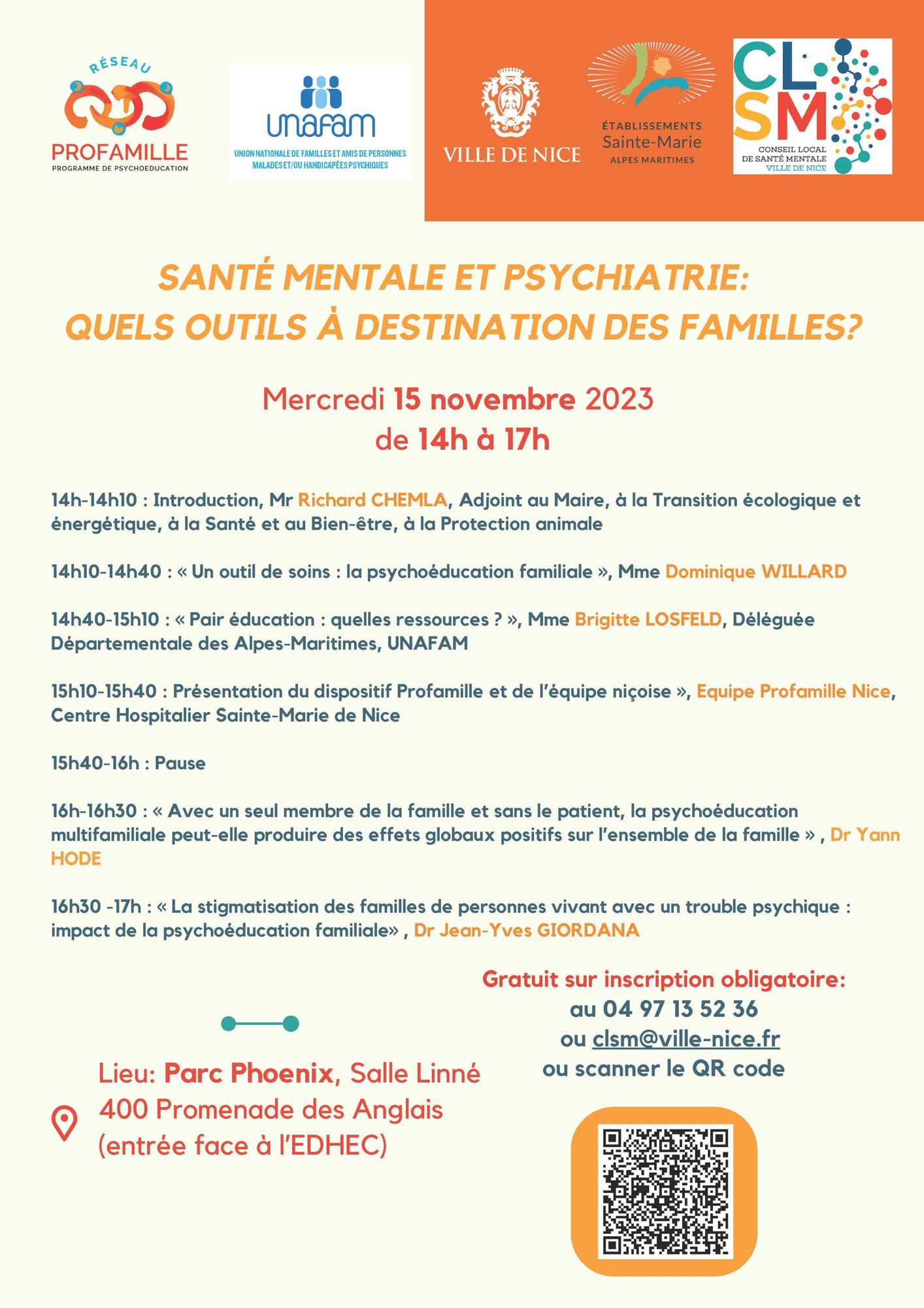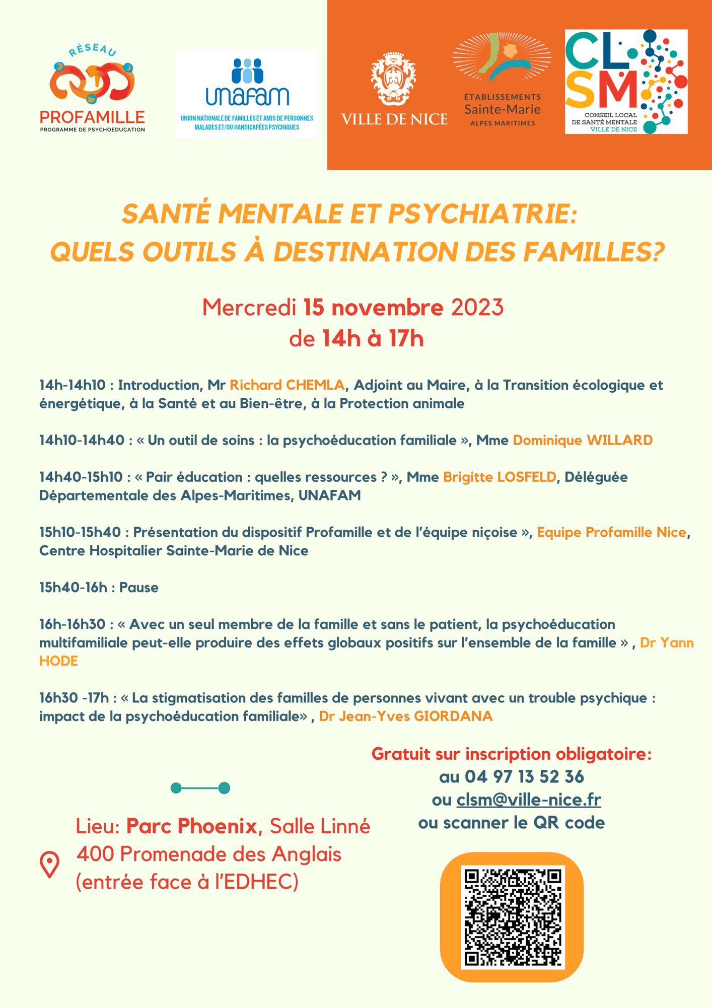 Le Réseau Profamille, l'UNAFAM, le conseil Local de Santé Mentale de la Ville de Nice et les Etablissements Sainte-Marie des Alpes-Maritimes vous invitent à la conférence "La stigmatisation des familles de personne vivant avec un trouble psychique : Impact de la psychoéducation familiale, avec l'intervention du Dr Jean-Yves GIORDANA - psychiatre, coordinateur du projet territorialdes Alpes-Maritimes, CODES06 et du Dr Yann HODE - psychiatre et président du RéseauProfamille.