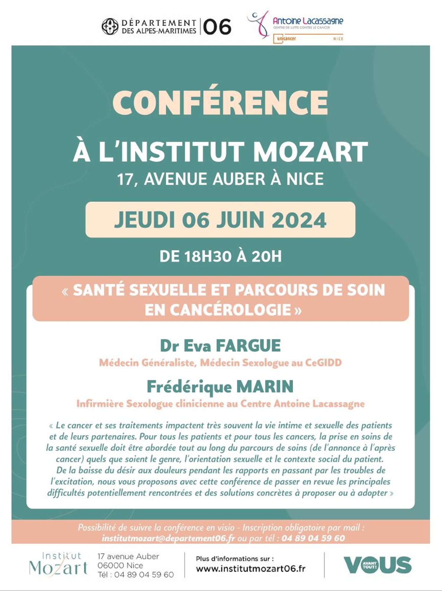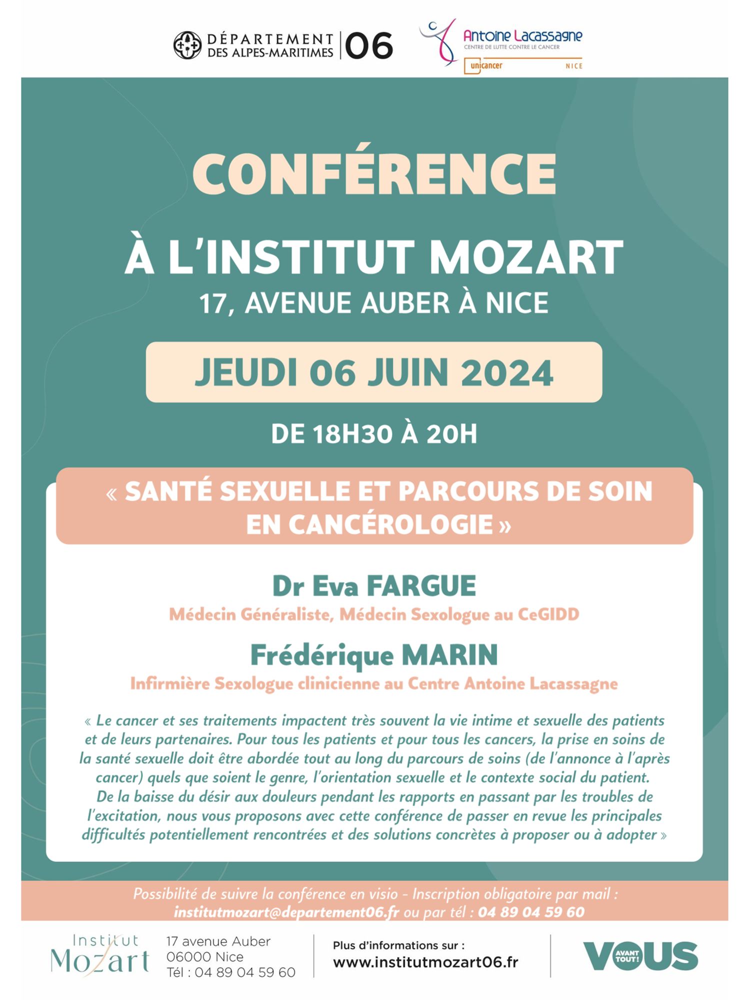 Dans le cadre de la semaine de Santé sexuelle, le Conseil départemental des Alpes-Maritimes organise une conférence « Santé Sexuelle et parcours de soin en cancérologie » le jeudi 06 Juin 2024 à 18h30 à l’Institut Mozart.