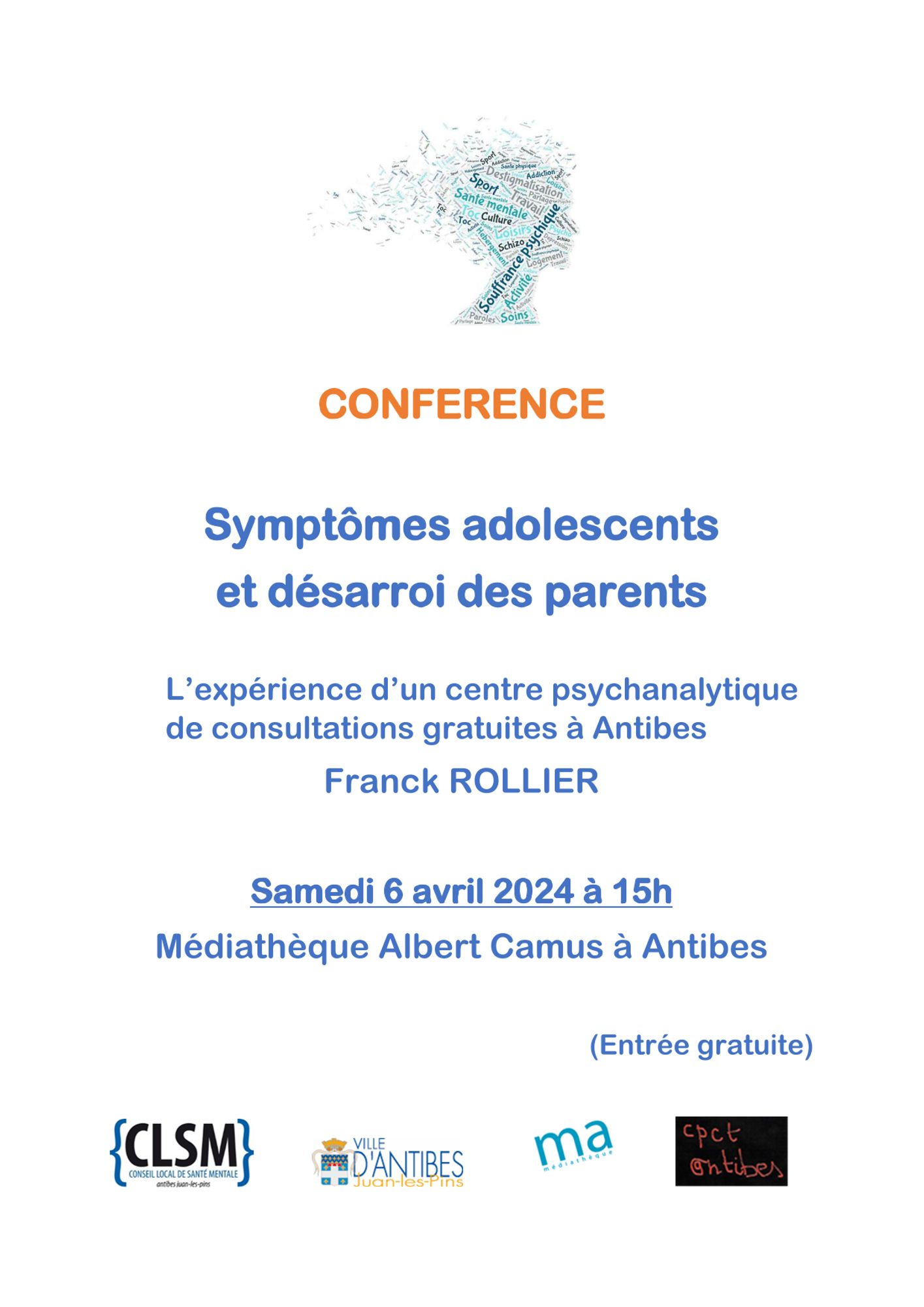 Le CLSM et la Ville d'Antibes organise une conférence sur le thème "Symptômes adolescents et désarroi des parents. L’expérience d’un centre psychanalytique de consultations gratuites à Antibes" animé par Franck ROLLIER, le Samedi 6 avril 2024 à 15h - Médiathèque Albert Camus à Antibes.