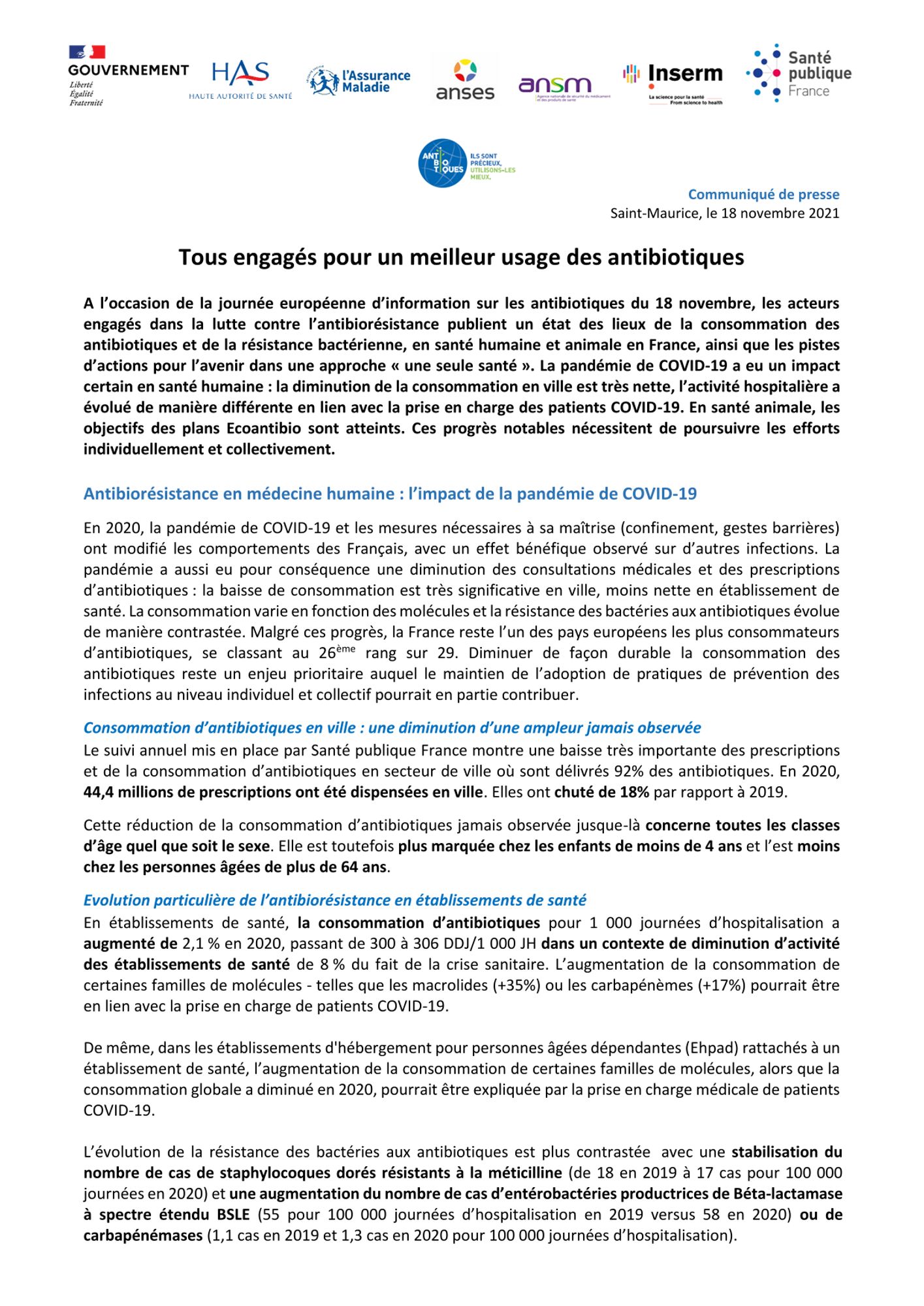 Les données du Système National des Données de Santé (SNDS), analysées par Santé publique France, mettent en évidence que la consommation d’antibiotiques en secteur de ville a enregistré en 2020 une baisse additionnelle d’environ 17 % en Doses Définies Journalières (DDJ) et de 18 % en nombre de prescriptions par rapport aux niveaux attendus pour 2020 en projetant les tendances déjà à la baisse des 10 années précédentes. Sur un nombre total de 44,4 millions de prescriptions d’antibiotiques en 2020, il y a eu 9,7 millions de prescriptions de moins que ce qui était attendu.