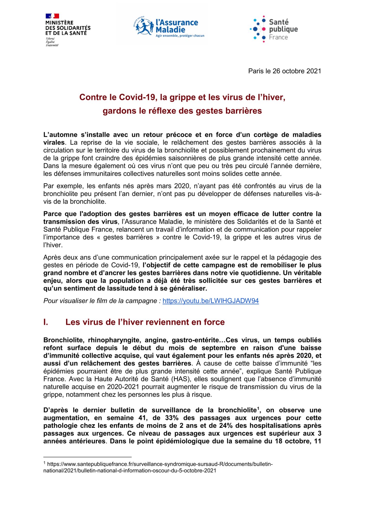 L’automne s’installe avec un retour précoce et en force d’un cortège de maladies virales. La reprise de la vie sociale, le relâchement des gestes barrières associés à la circulation sur le territoire du virus de la bronchiolite et possiblement prochainement du virus de la grippe font craindre des épidémies saisonnières de plus grande intensité cette année.