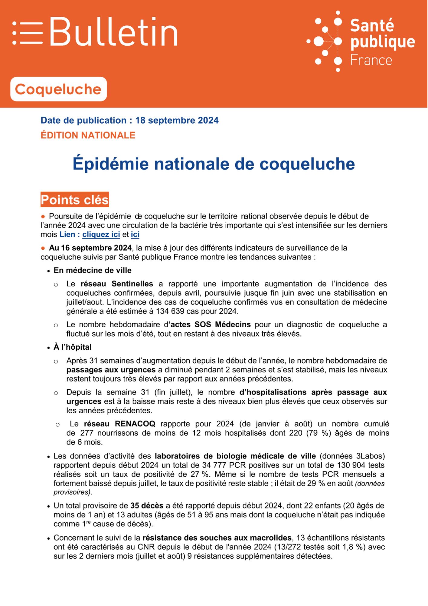 Poursuite de l’épidémie de coqueluche sur le territoire national observée depuis le début de l’année 2024 avec une circulation de la bactérie très importante qui s’est intensifiée sur les derniers mois