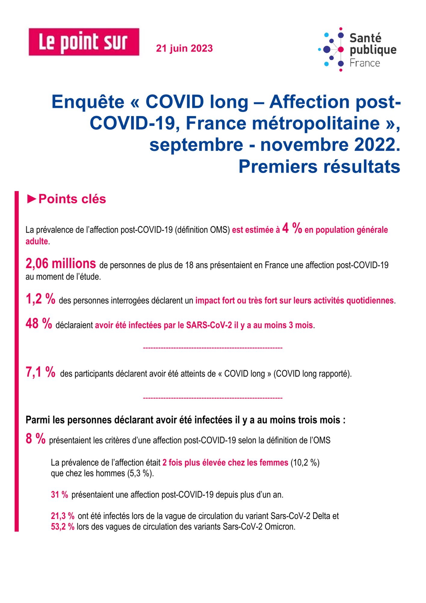 Santé publique France publie et présente aux Rencontres de santé publique 2023 les premiers résultats d’une nouvelle étude visant à estimer la prévalence du COVID long, réalisée sur un échantillon aléatoire de la population générale en France métropolitaine entre septembre et novembre 2022.