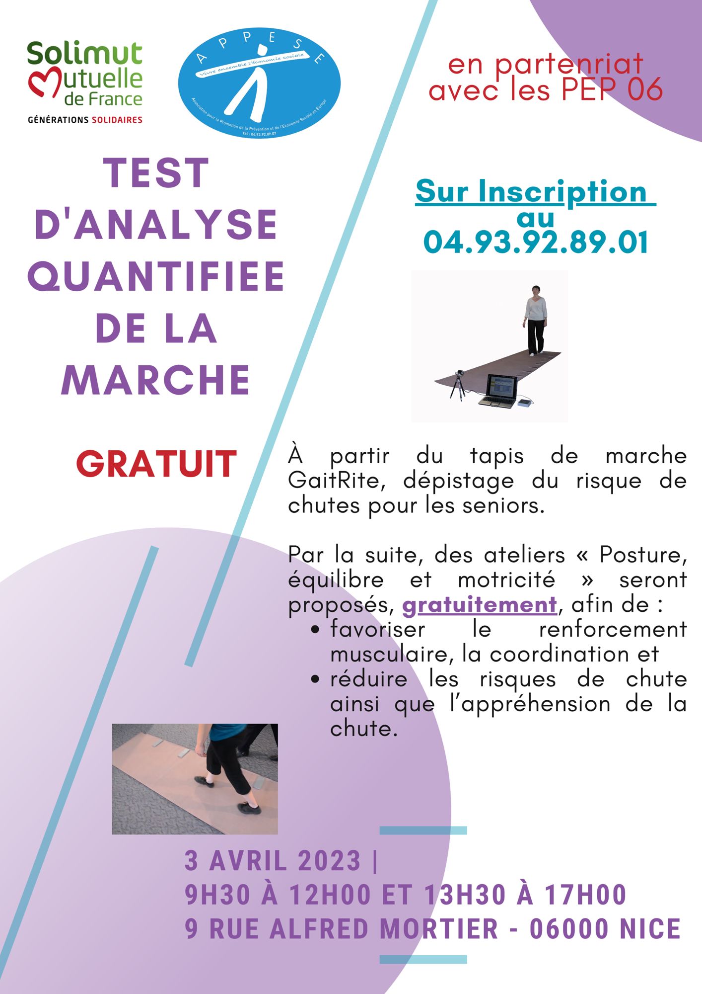 La Solimut mutuelle de France vous invite à un dépistage d'analyse quantifiée de la marche, le Lundi 3 avril 2023 de 9h30 à 12h00 et de 13h30 à 17h00 au 9 rue Alfred Mortier - 06000 Nice