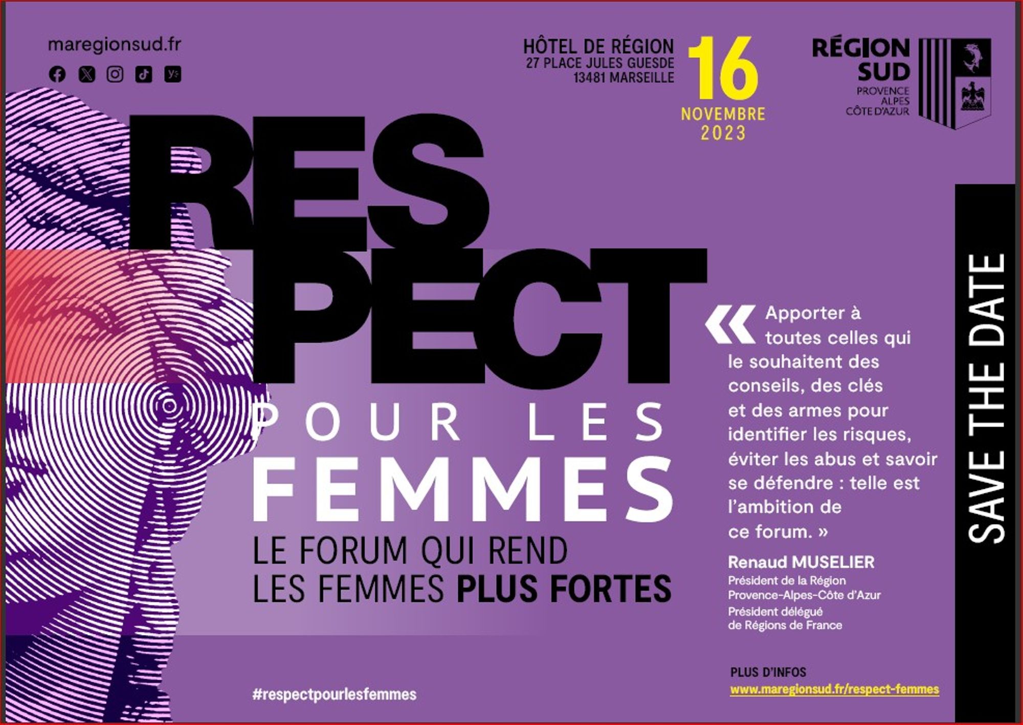 Fort de son succès, le Forum Respect pour les Femmes revient cette année pour une seconde édition. Je vous donne rendez-vous le jeudi 16 novembre 2023 à l’Hôtel de Région de 13h30 à 19h.