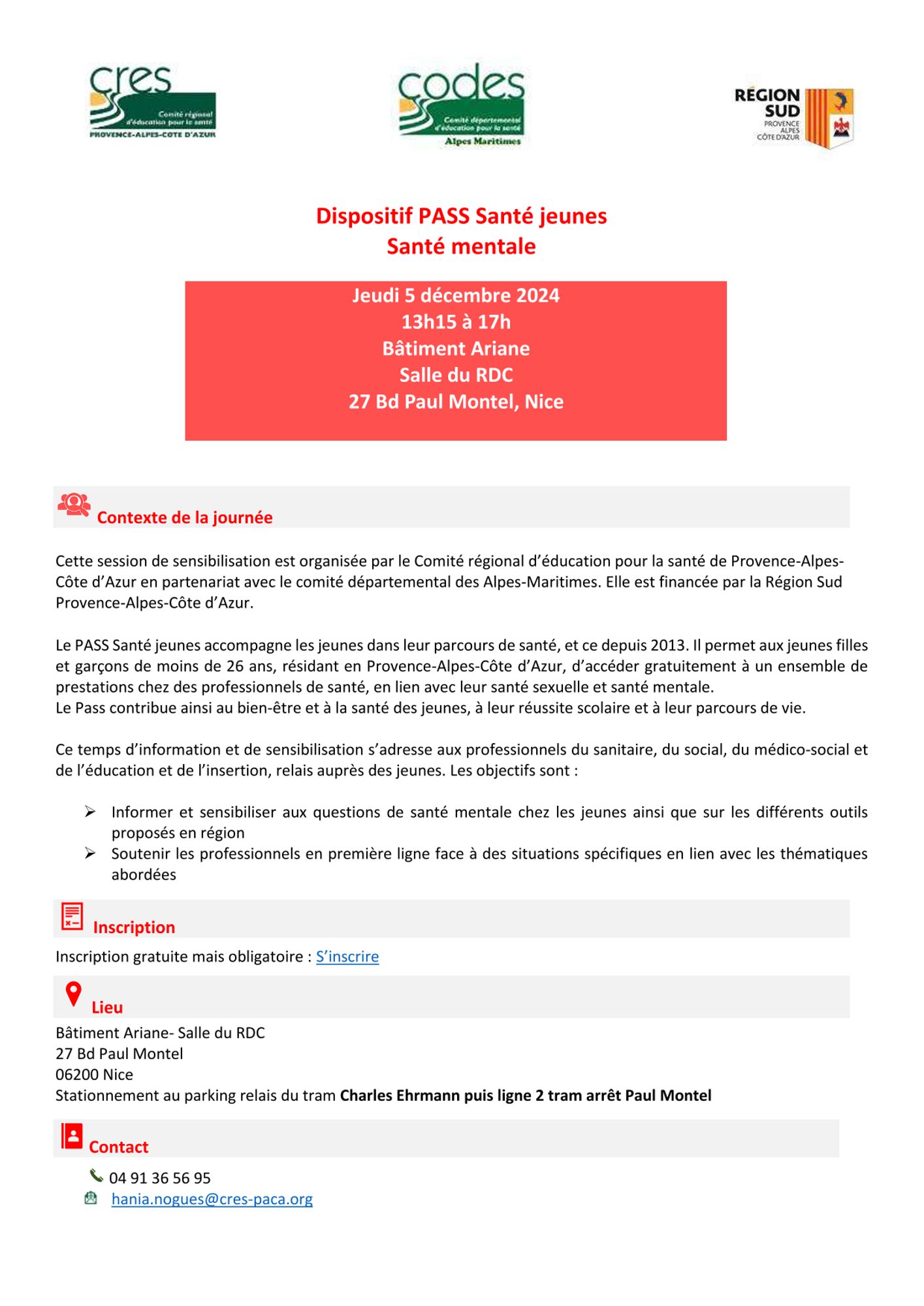Cette session de sensibilisation est organisée par le Comité régional d’éducation pour la santé de Provence-Alpes-Côte d’Azur en partenariat avec le comité départemental des Alpes-Maritimes. Elle est financée par la Région Sud Provence-Alpes-Côte d’Azur.